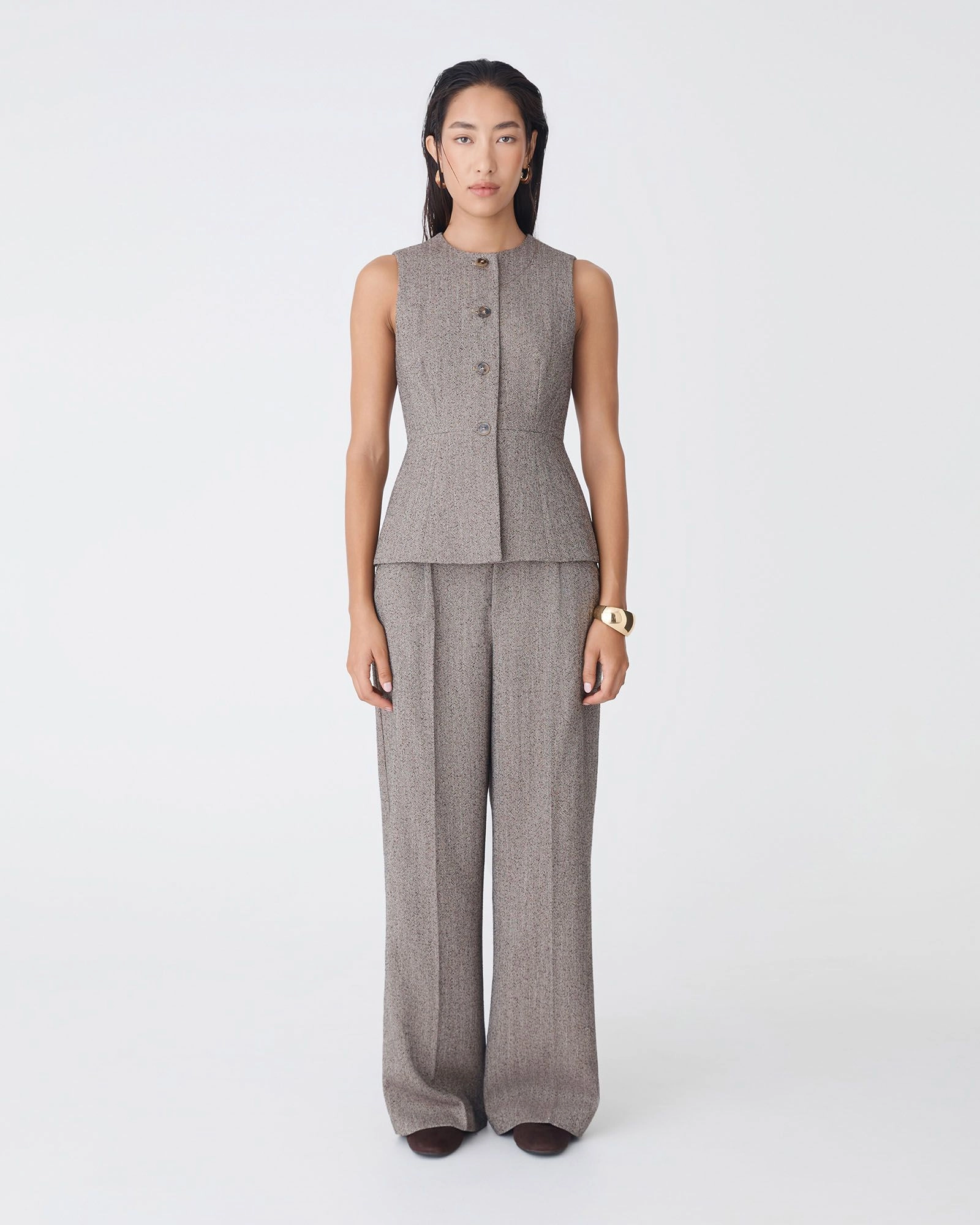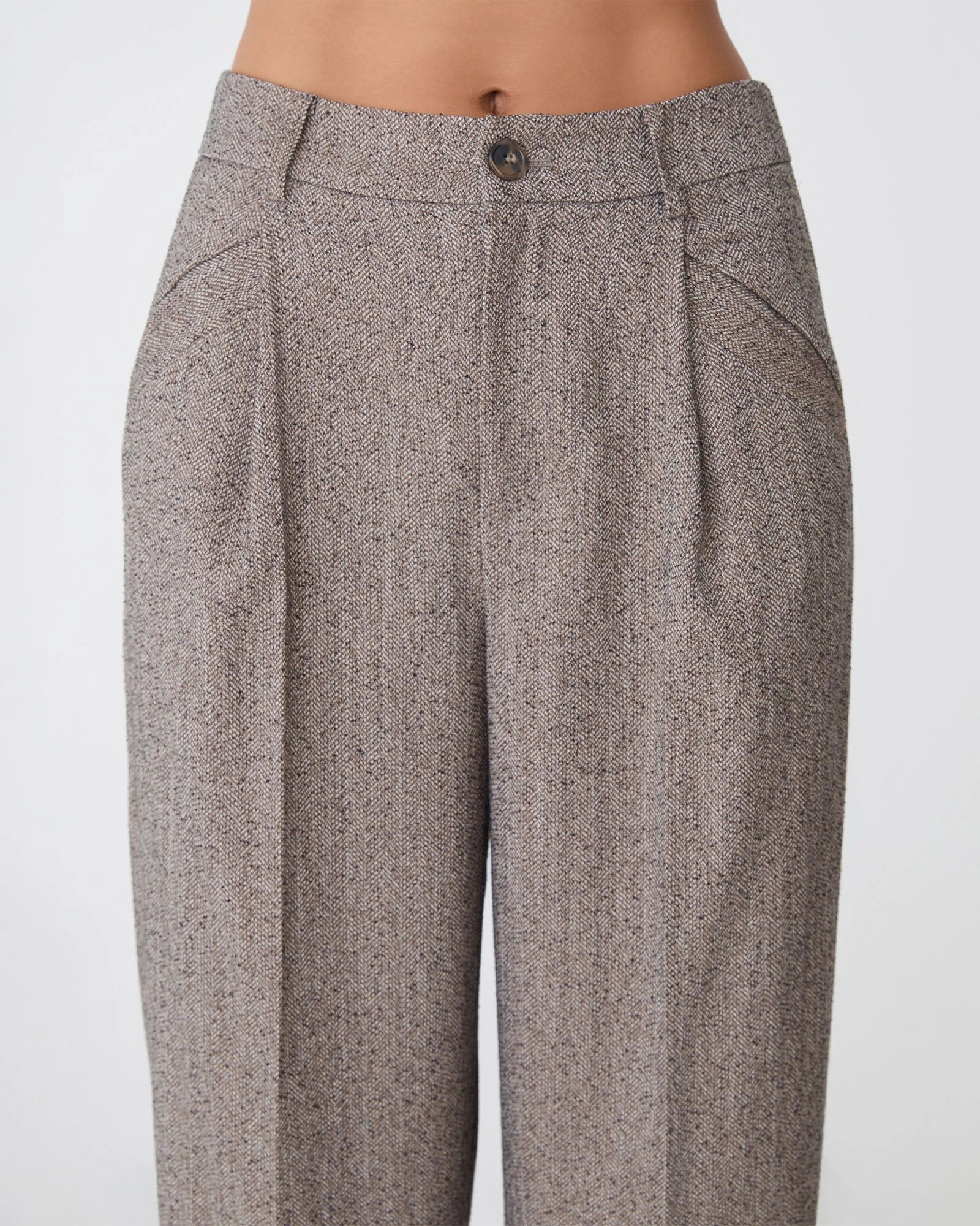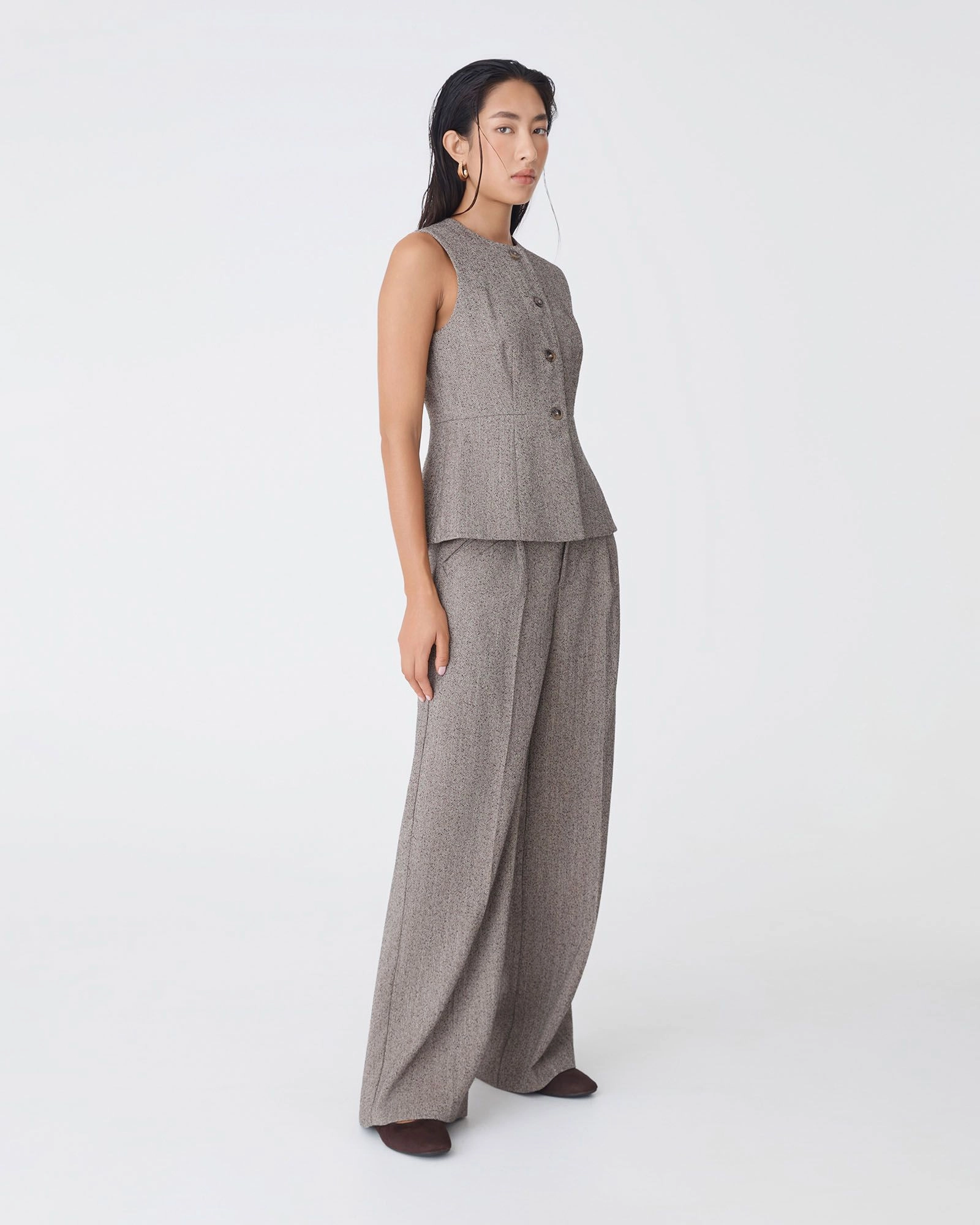 Elevate your tailored look with the Nevada Herringbone Pants. Featuring a wide-leg silhouette and textured herringbone pattern, these pants have front pleats, a fixed waistband with belt loops, functional side pockets - making them a versatile choice for work or elevated weekend styling. Style with your essential tops and blouses or pair with the matching vest for a power-suit aesthetic.