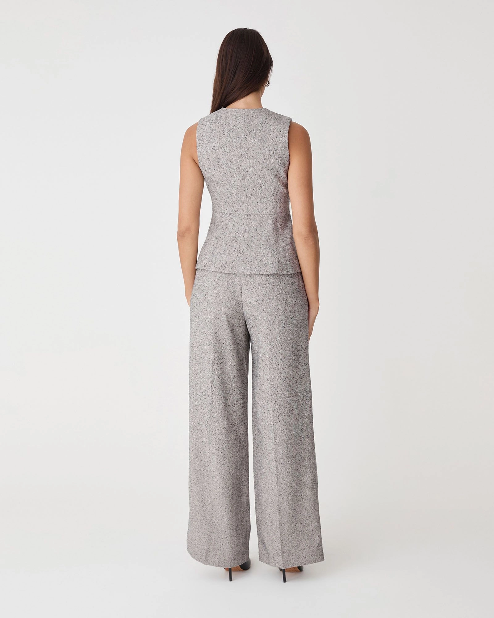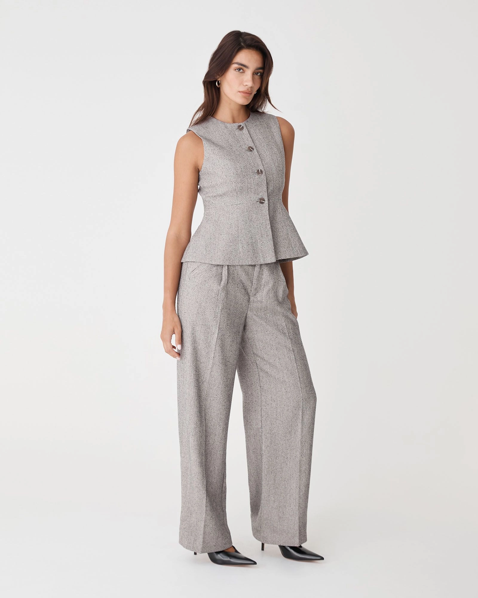 Textured and modern, the Nevada Herringbone Vest features a herringbone weave that adds detail to the design. Featuring a peplum hem that flares from the waist, it creates a structured, hourglass shape, while the collarless neckline and button-front closure complete the bodice. Style with wide-leg pants or wear with the matching Nevada Herringbone Pants to complete the look.