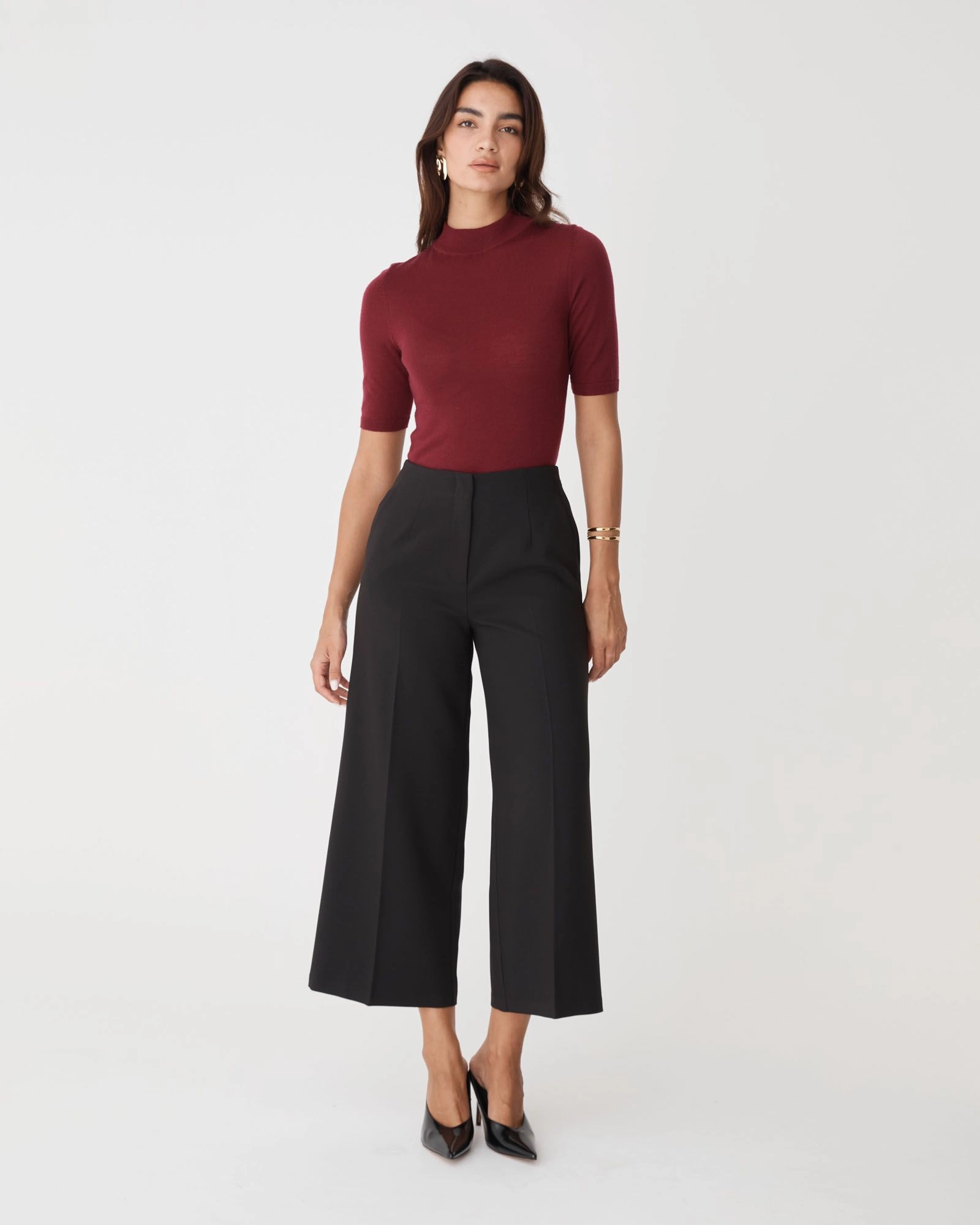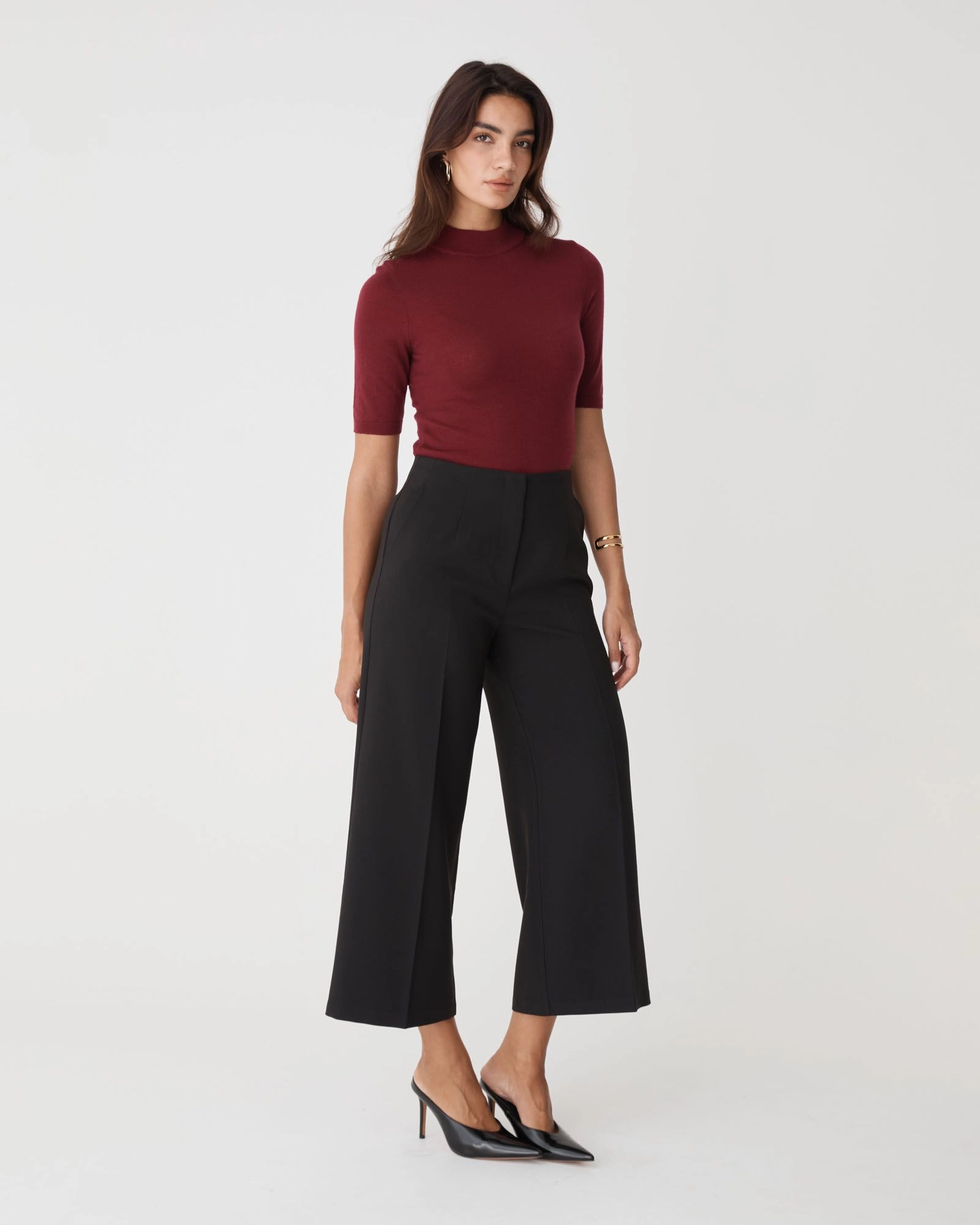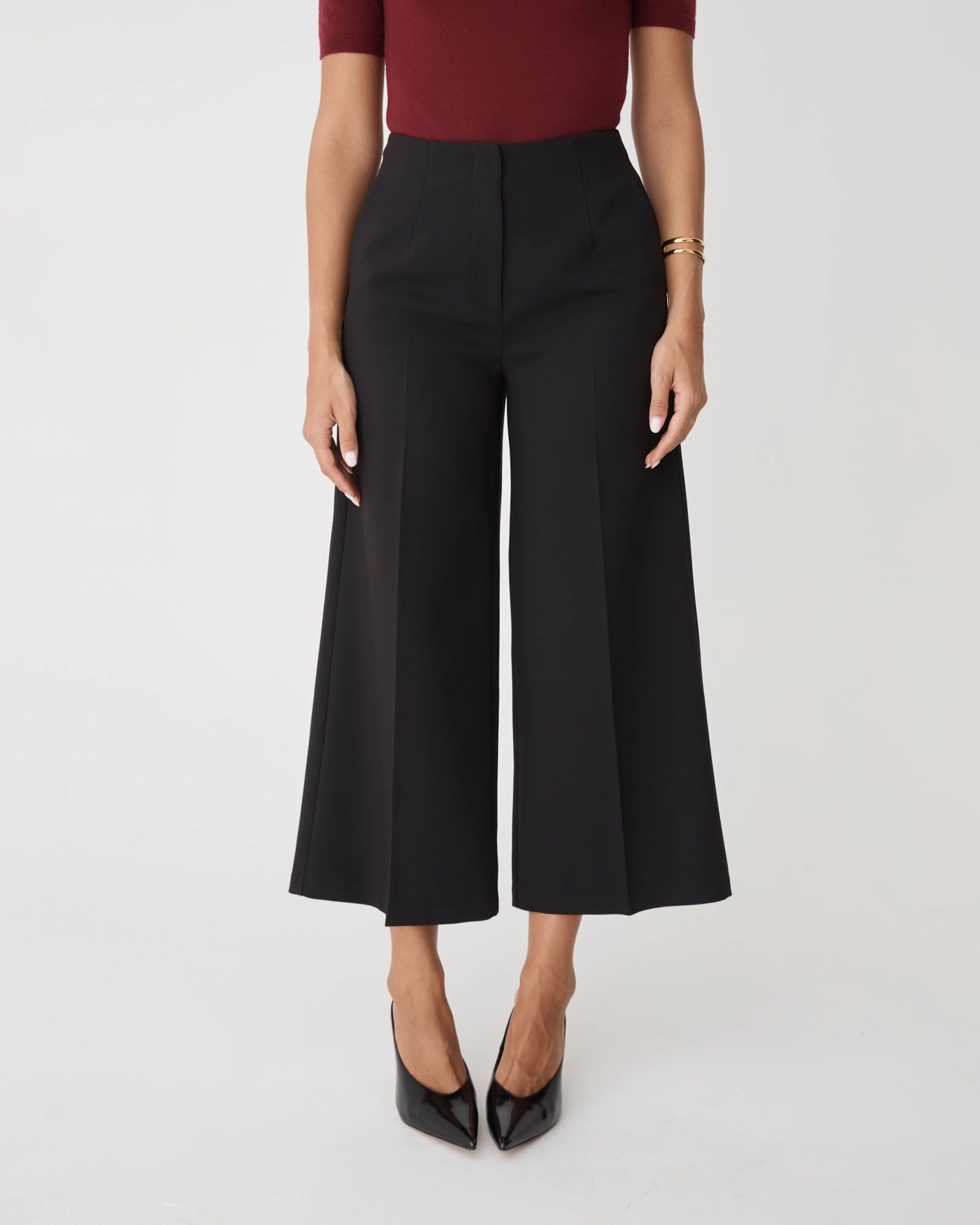 - Wide-leg culotte silhouette with cropped length
