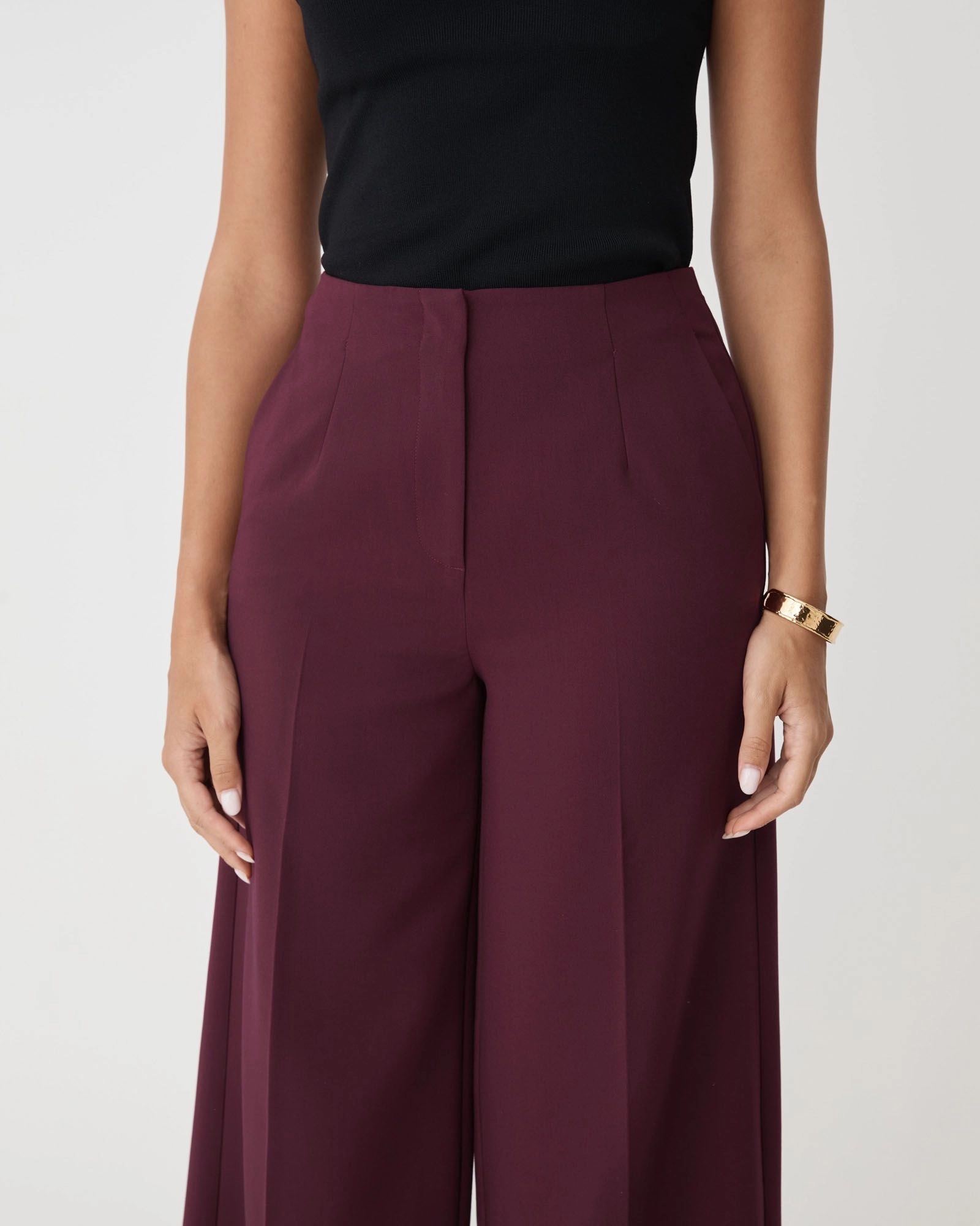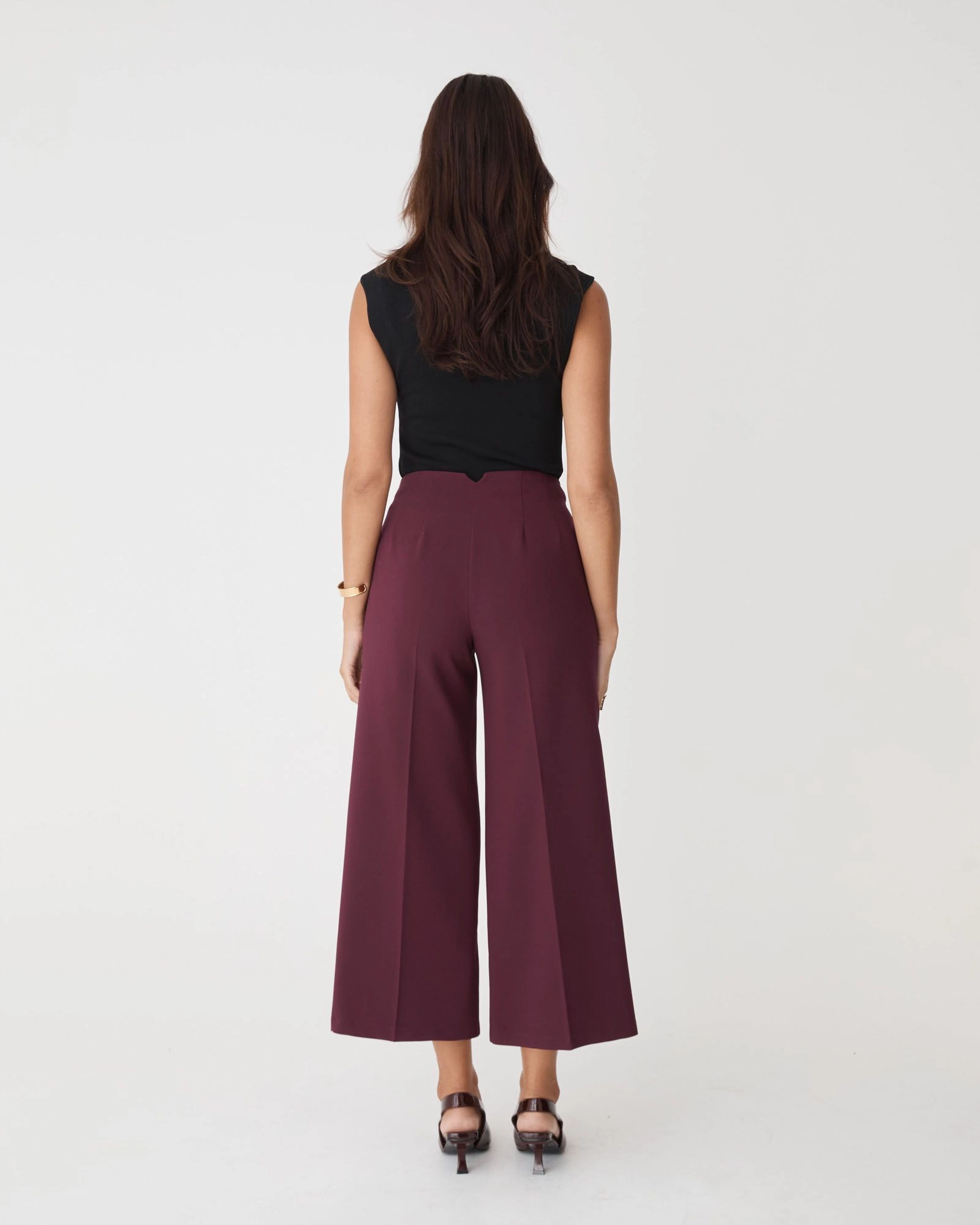 The Nikki Culotte Trousers feature a wide-leg, cropped silhouette with sharp tailoring. Crafted from structured fabric, finished with crisp press creases and front and back waist darts for a contoured, flattering fit through the hips. A subtle notch detail in the waistband adds a modern, unique edge.