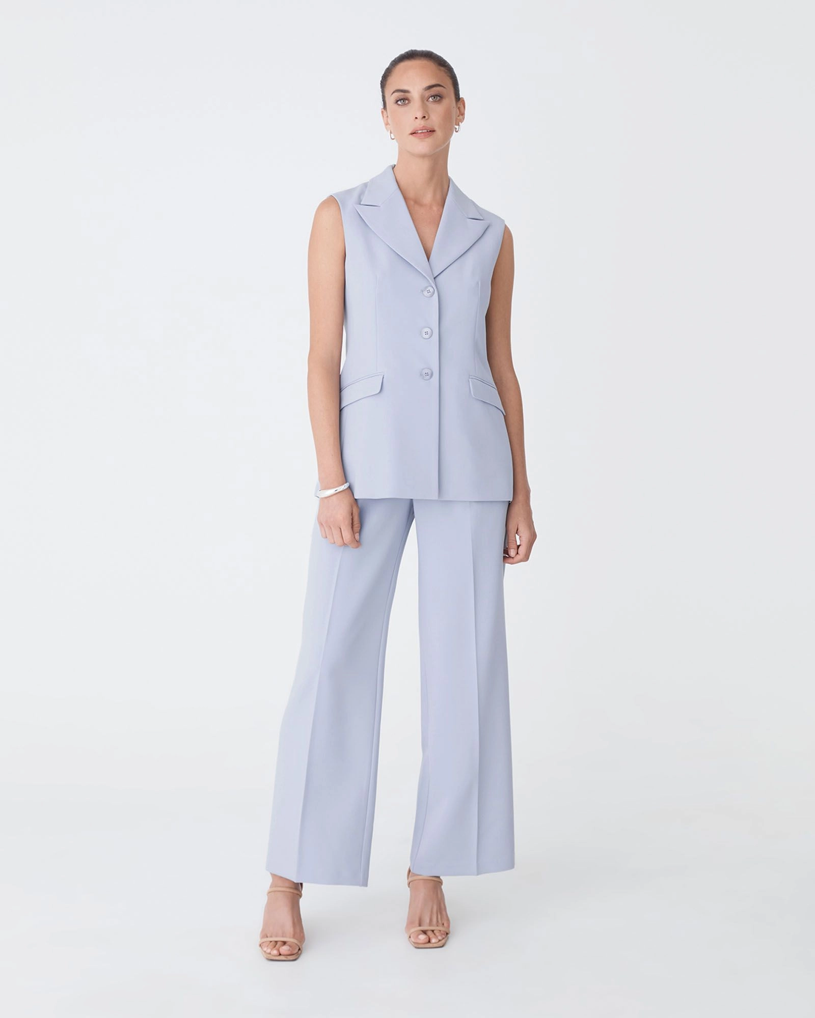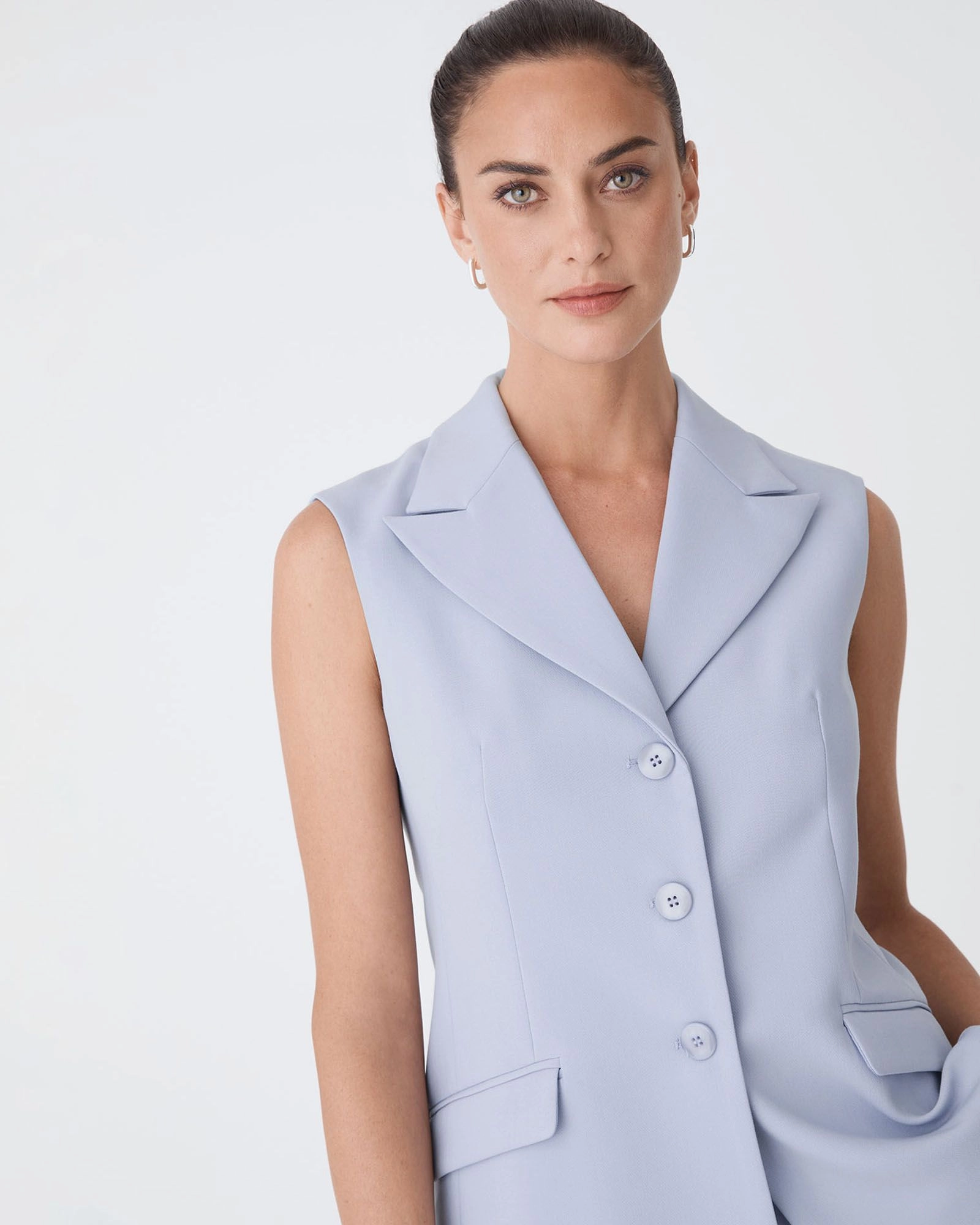 The Nikki Long Collared Vest features sharp peak lapels, a triple-button front, and functional flap pockets for a polished, structured look. Finished with a center-back vent, it pairs perfectly with the Nikki Tailored Pants for layers effortlessly over casual separates for an elevated style.