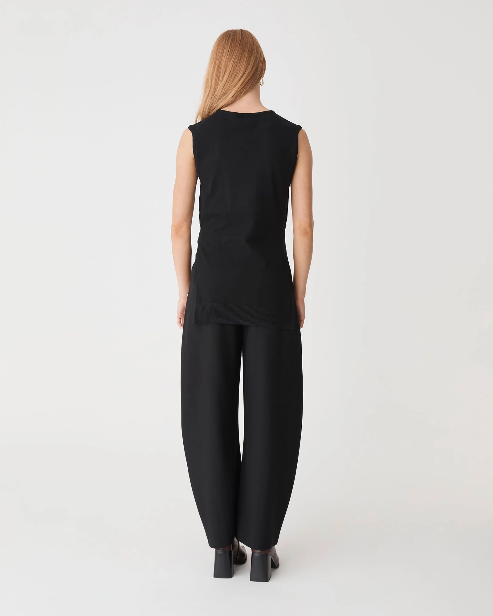 The Nora Sleeveless Tie Waist Knit features a sleeveless cut with a classic crew neckline, offering a relaxed fit that can be shaped at the waist with an attached self-tie detail. Side splits and a hi-low hem allow for easy movement and effortless styling over trousers.
