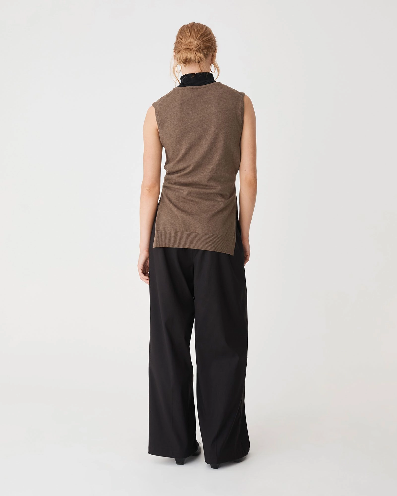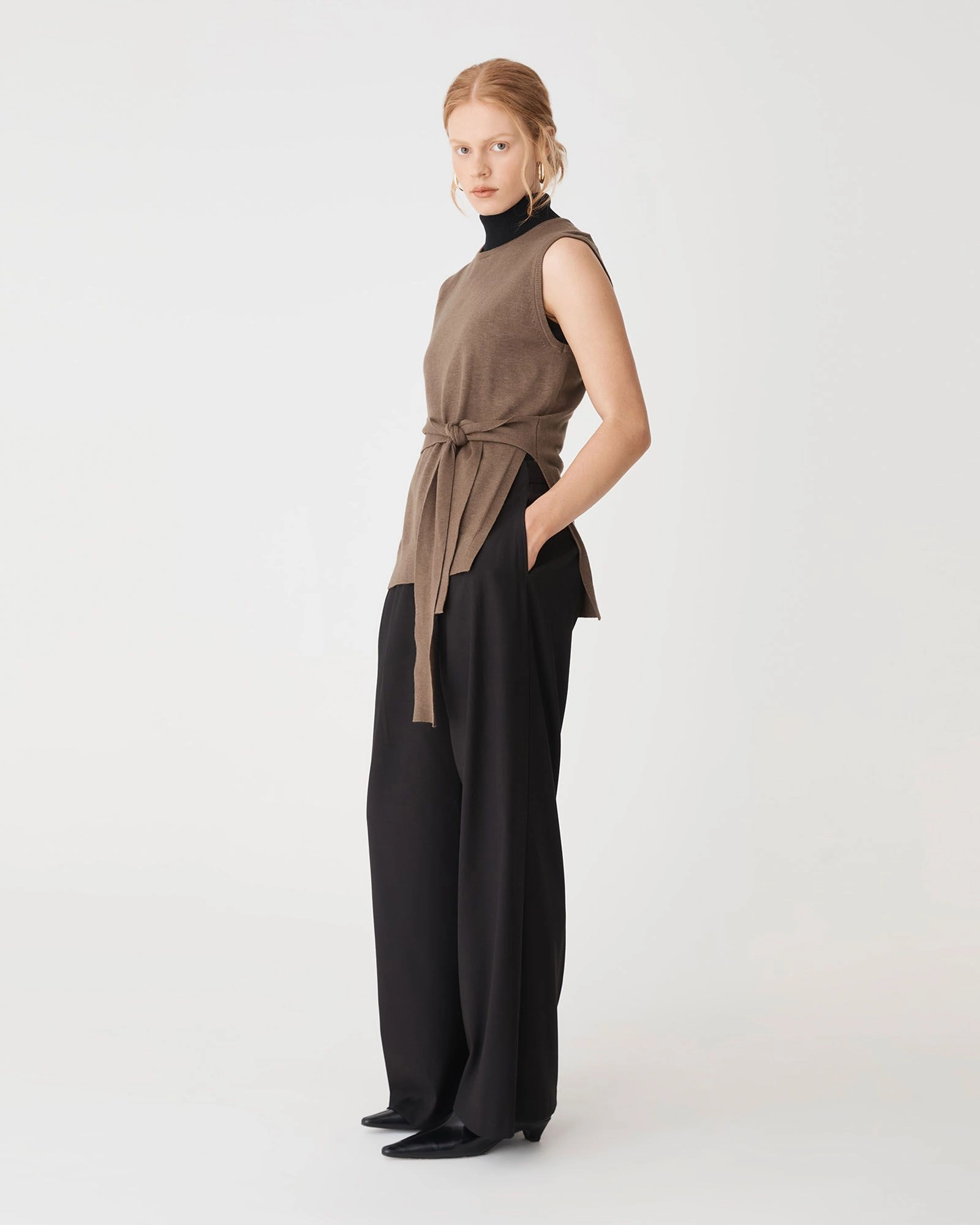 The Nora Sleeveless Tie Waist Knit features a sleeveless cut with a classic crew neckline, offering a relaxed fit that can be shaped at the waist with an attached self-tie detail. Side splits and a hi-low hem allow for easy movement and effortless styling over trousers.