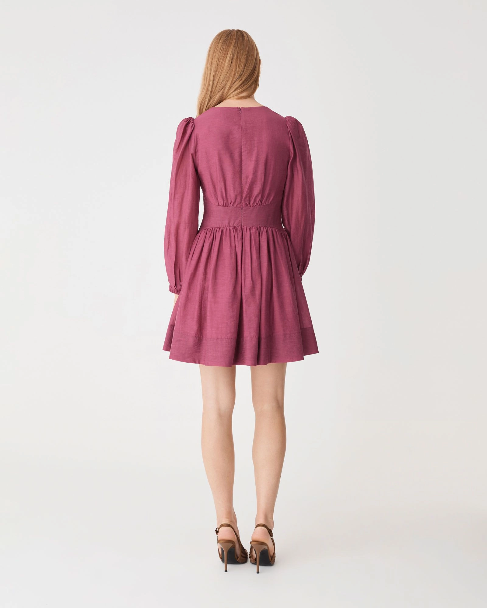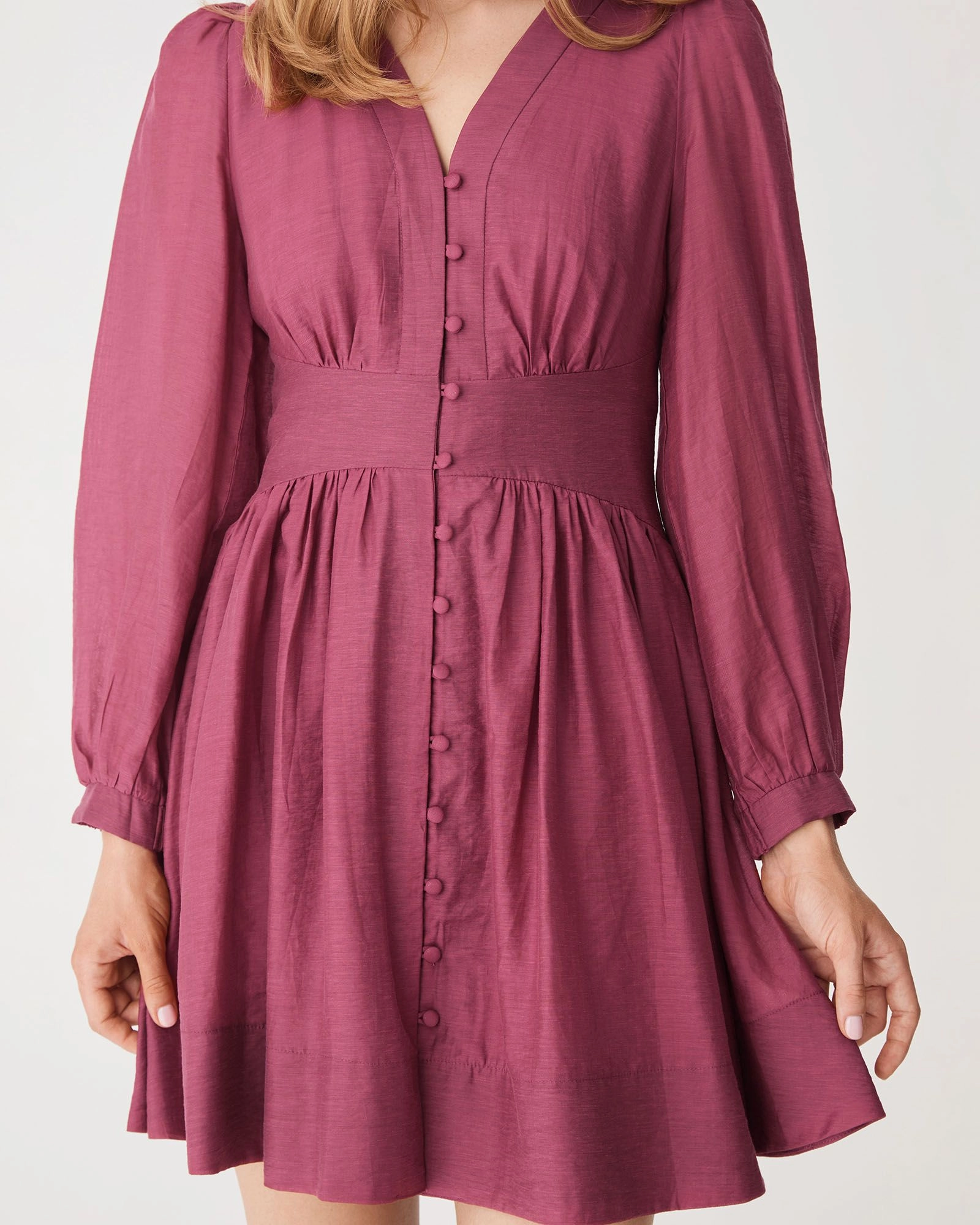 The Paloma V-Neck Mini Dress is an elevated modern piece that features a flattering V-neckline with front loop button closure, long balloon sleeves and a gathered waist for shape. Finished with a line body and mini in length, it is an easy option for day-to-night dressing.