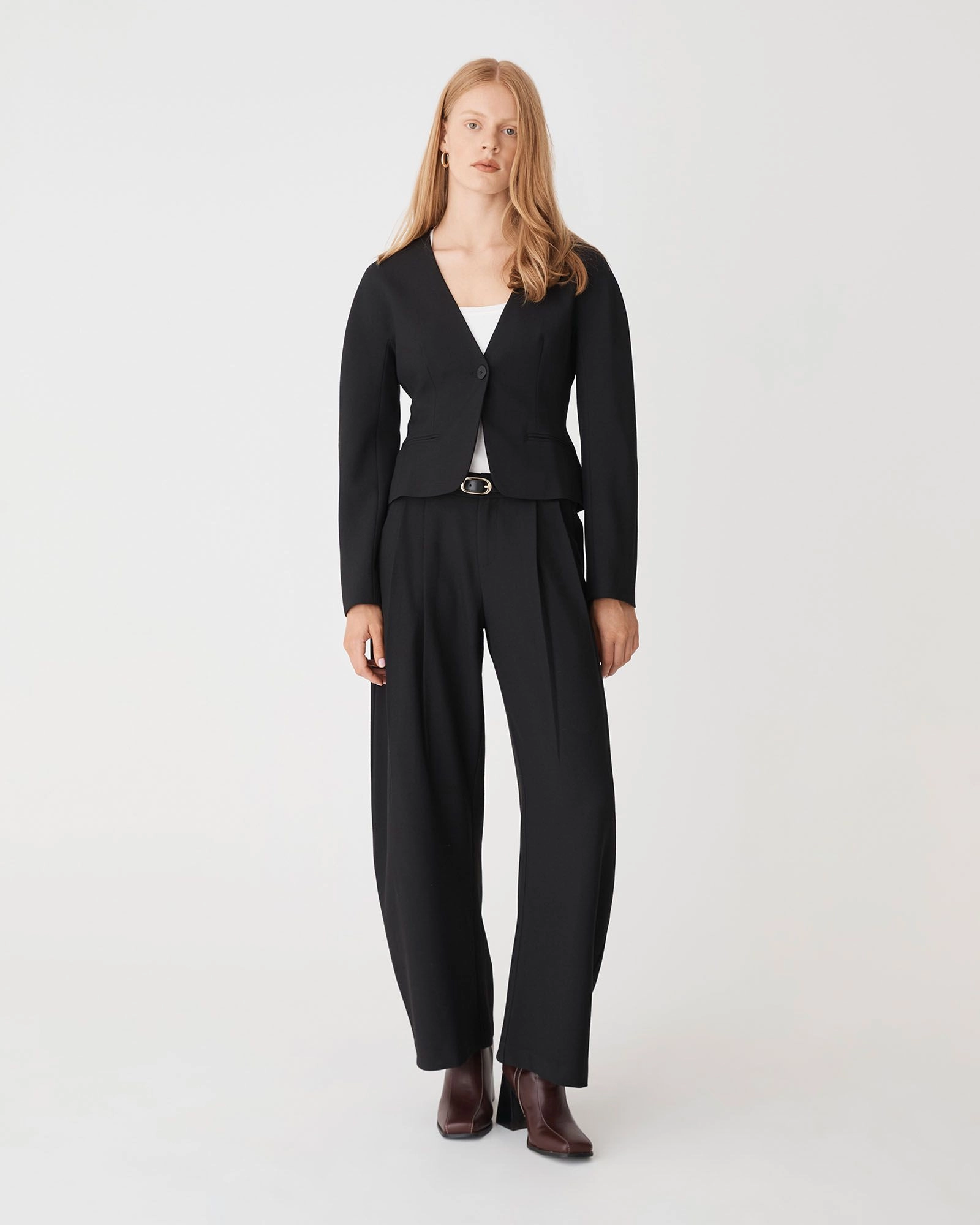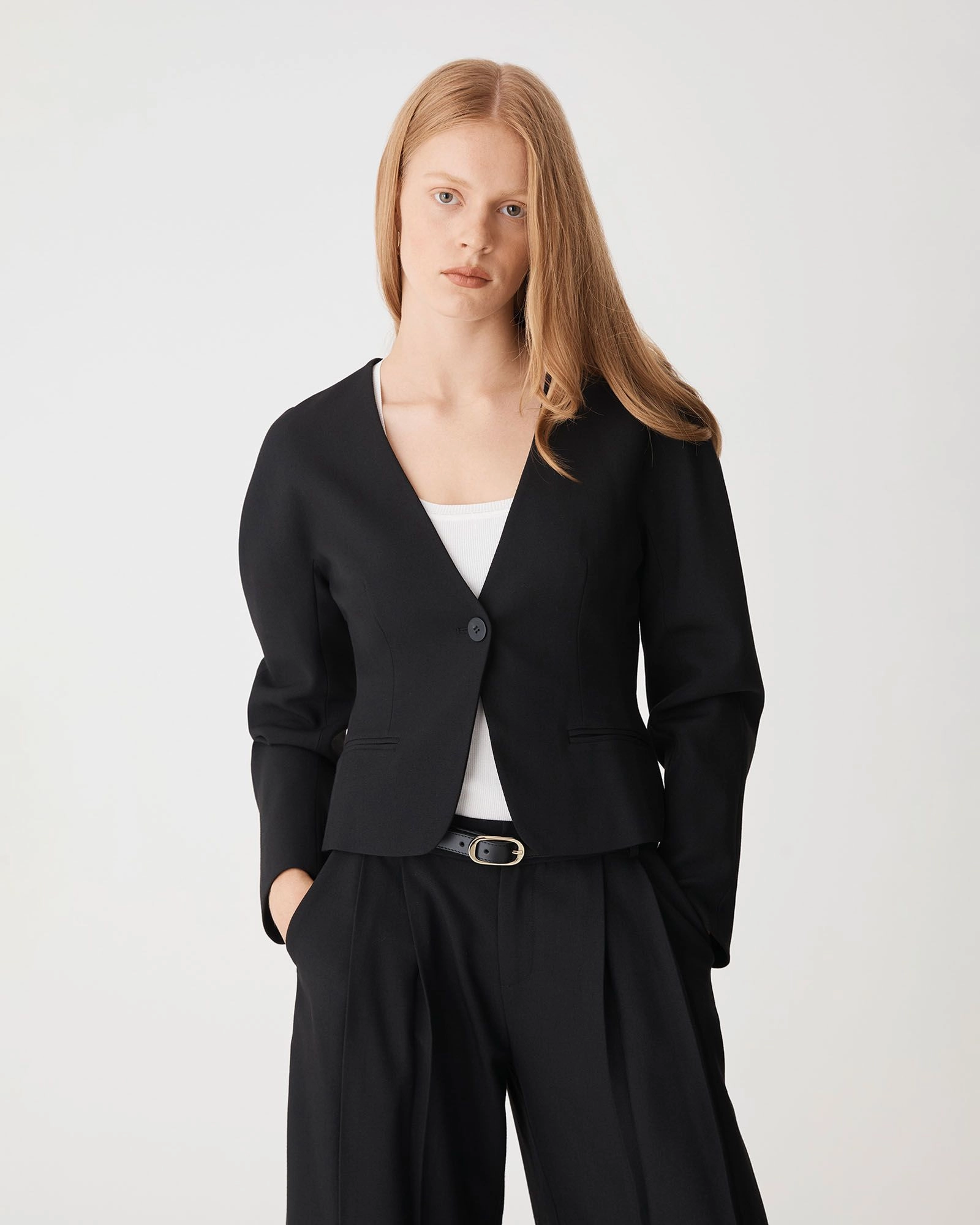 The Pippa Rounded Shoulder Blazer features a sculpted silhouette with rounded shoulders and a deep V-neckline. Designed with a cropped length and contoured paneling, it offers a tailored fit that defines the shape. Style with tailored pants for a sleek set, or pair with denim and heels for a modern, elevated look.