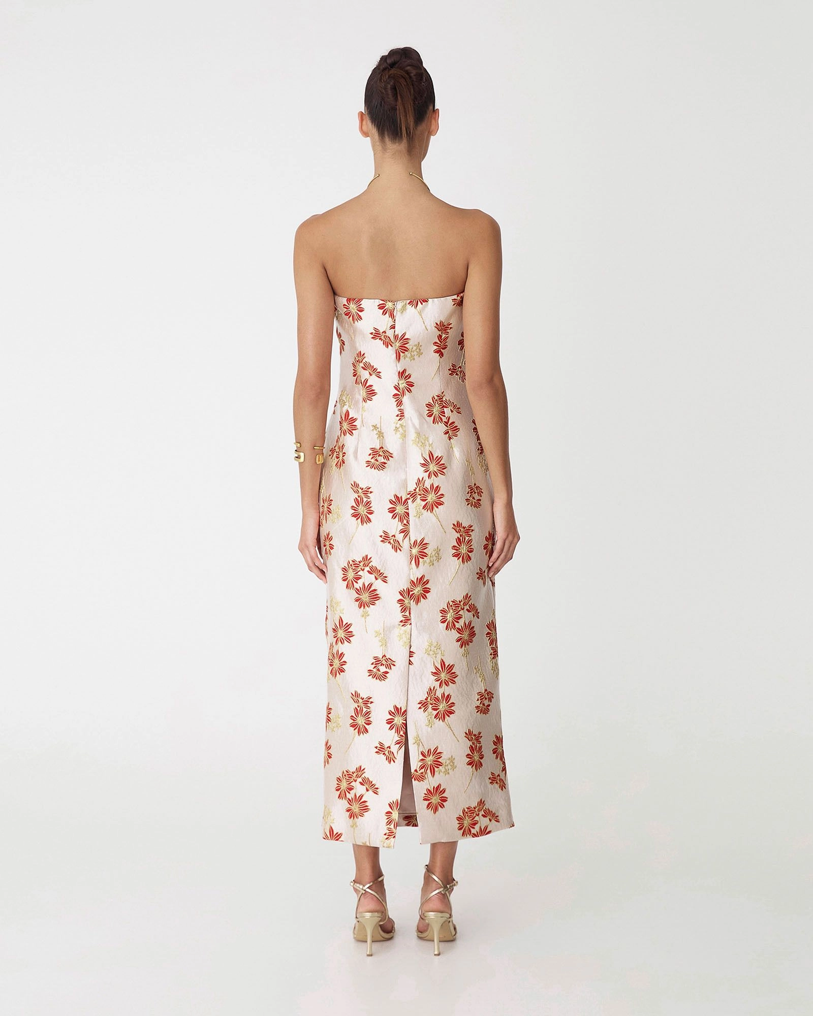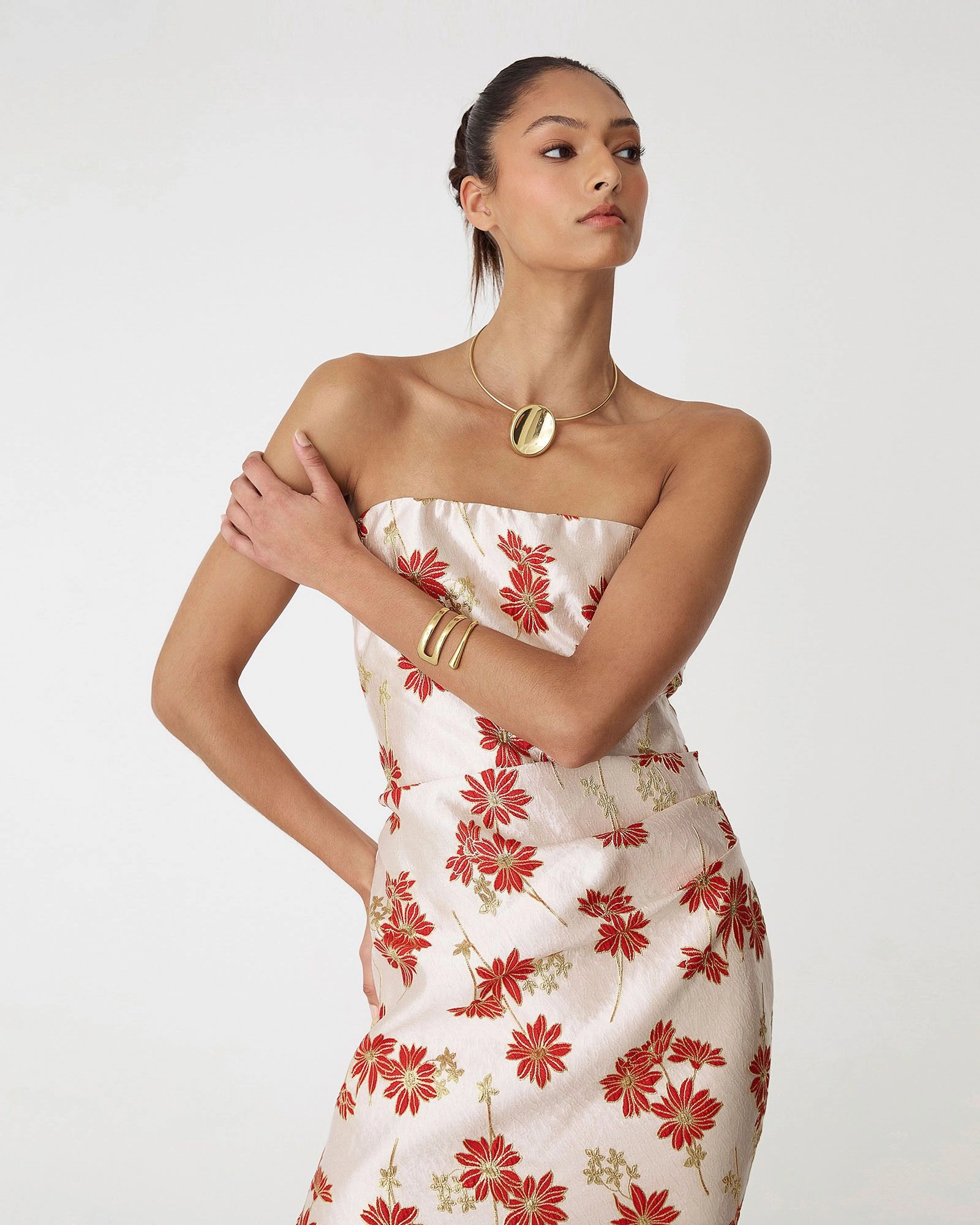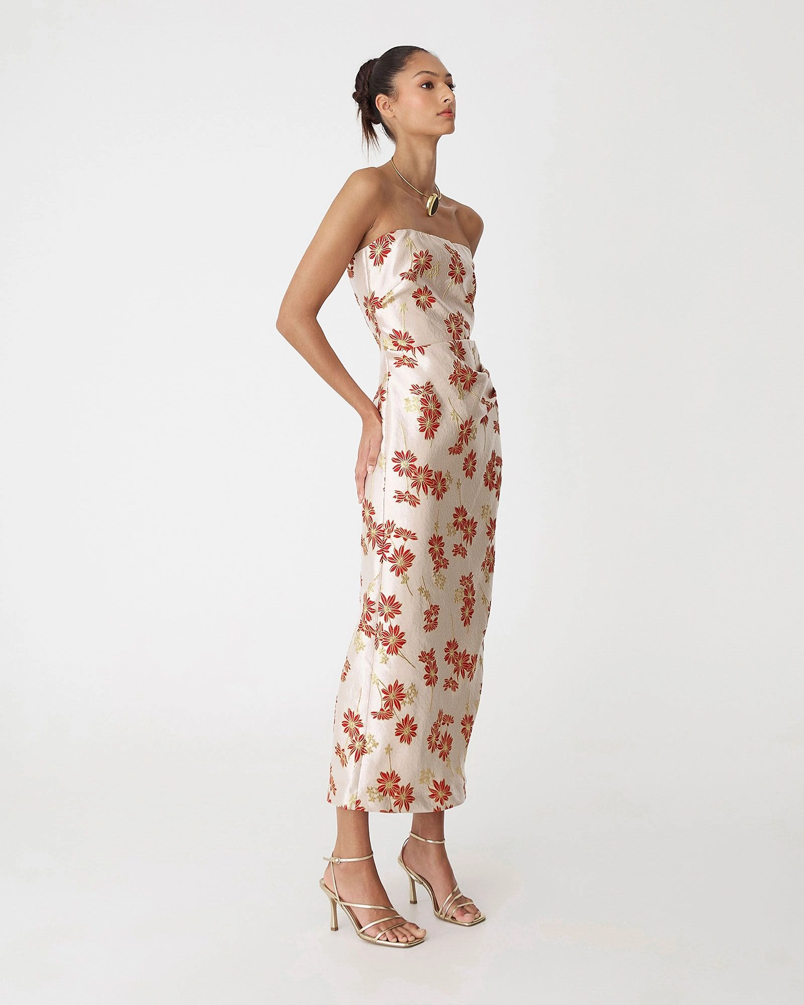 The Priya Strapless Column Dress features a sleek column silhouette that skims the body for an elongating effect. With a striking intricate red and gold floral pattern, it features a strapless neckline, side pleated details, and an invisible back zipper to finish. Style with statement jewellery to perfect your occasion look.