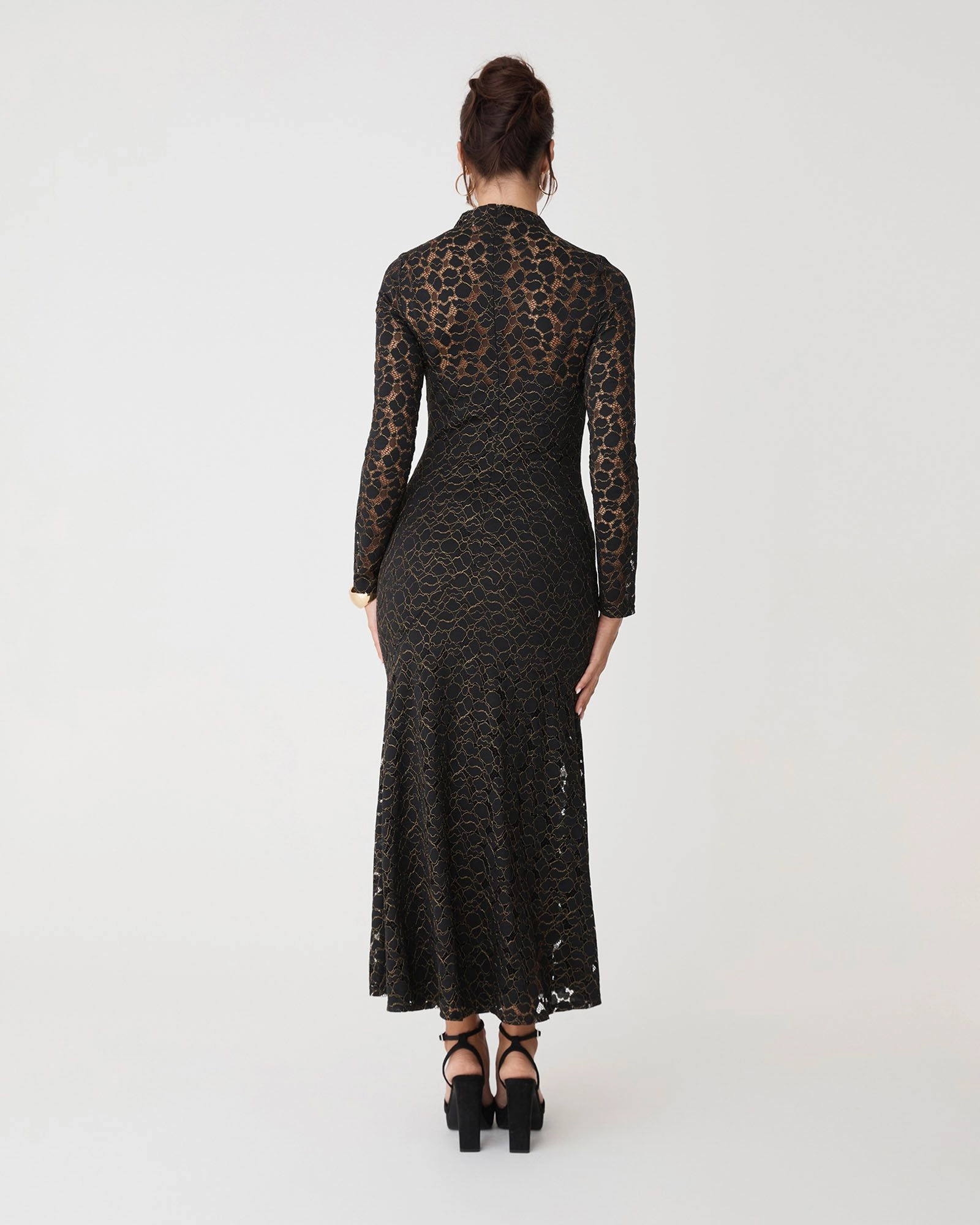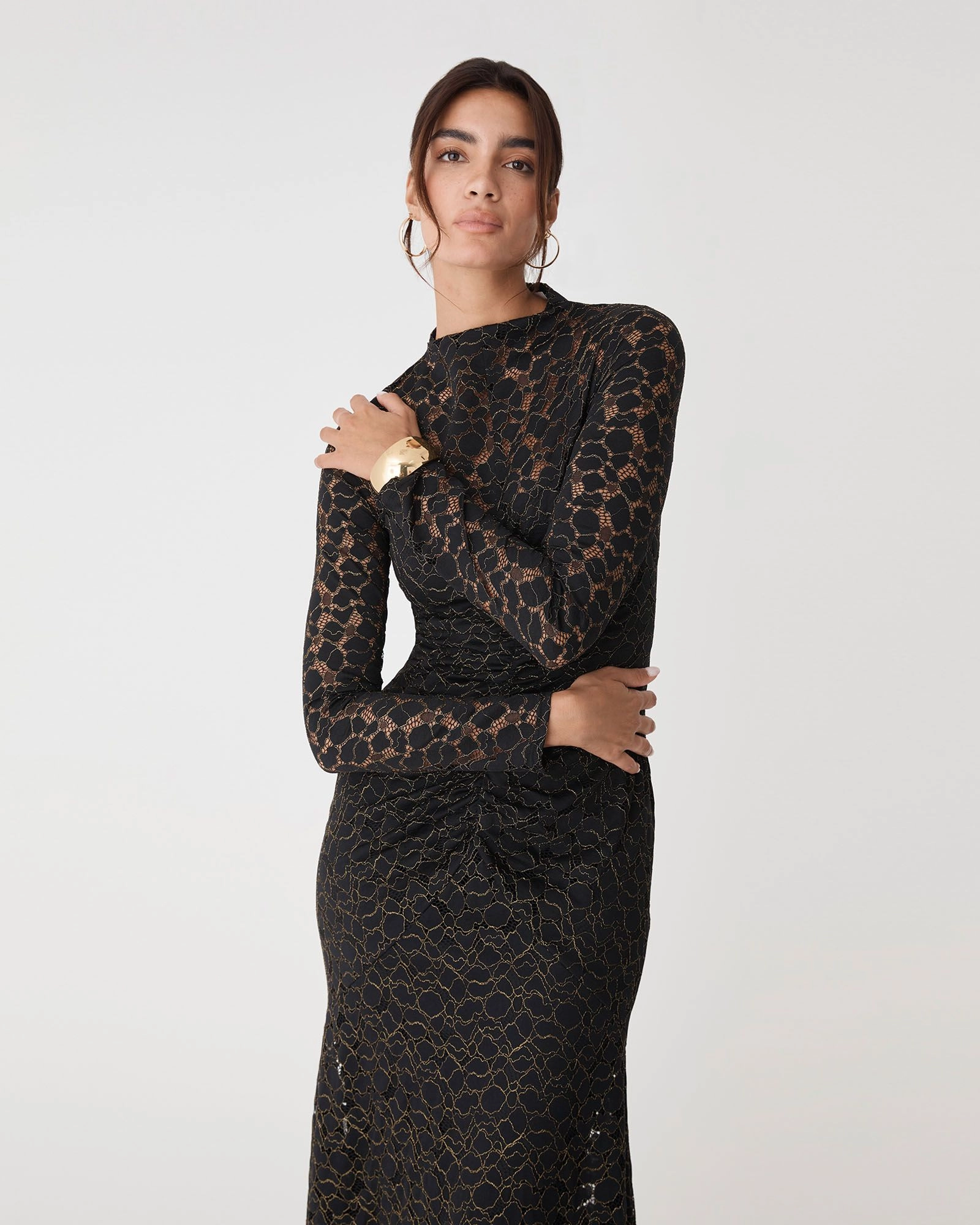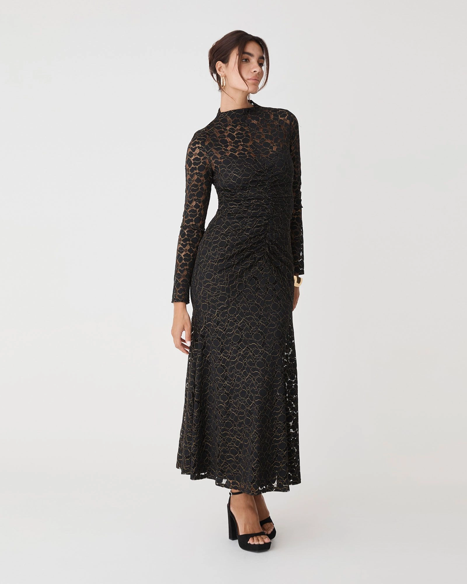 The Romy Lace Ruched Dress blends intricate lace with a flattering, ruched silhouette for a striking occasion look. Designed with a high neckline and long, slim sleeves, it balances elegance with modern sophistication. Pair with statement heels and bold accessories for a refined, contemporary finish.