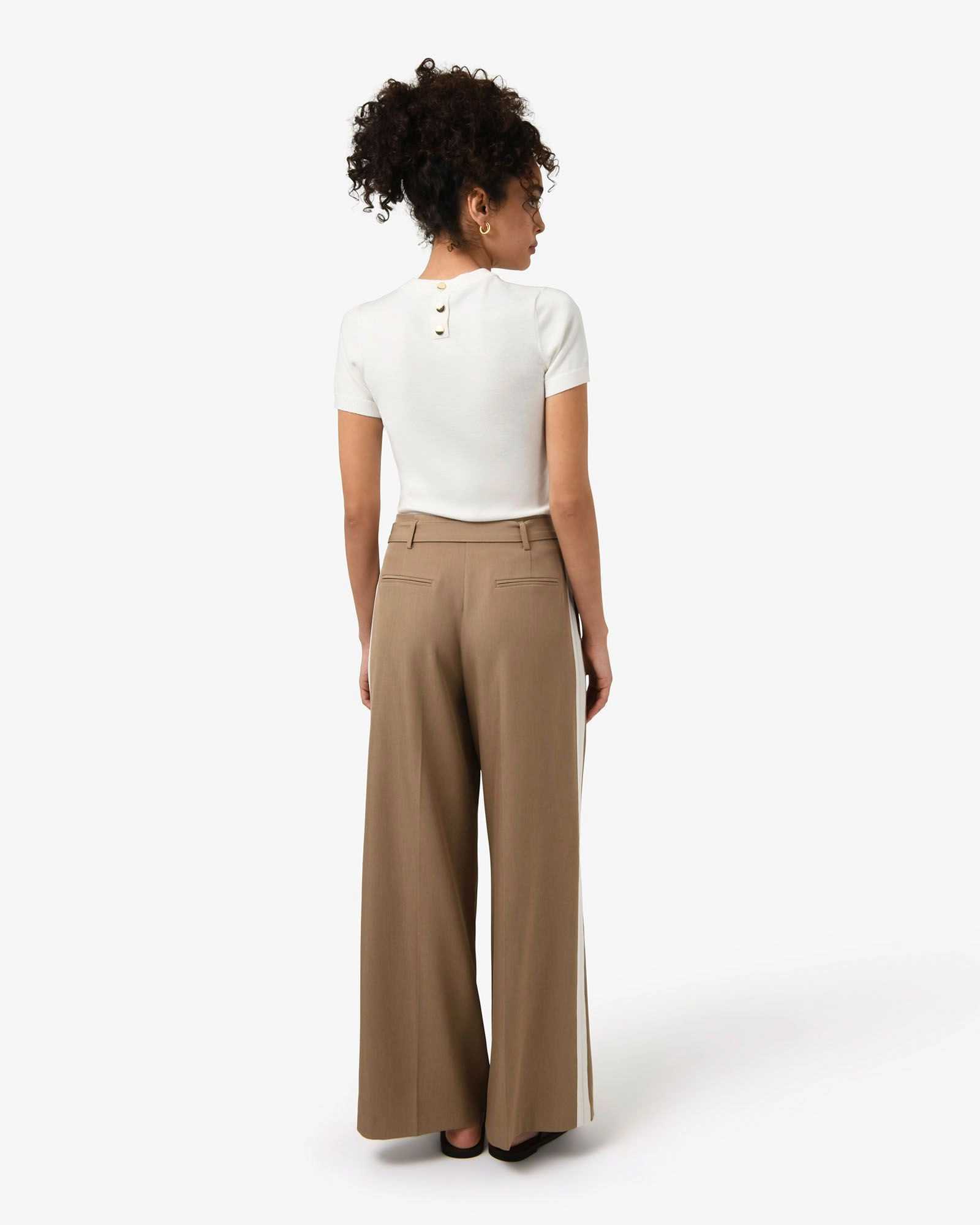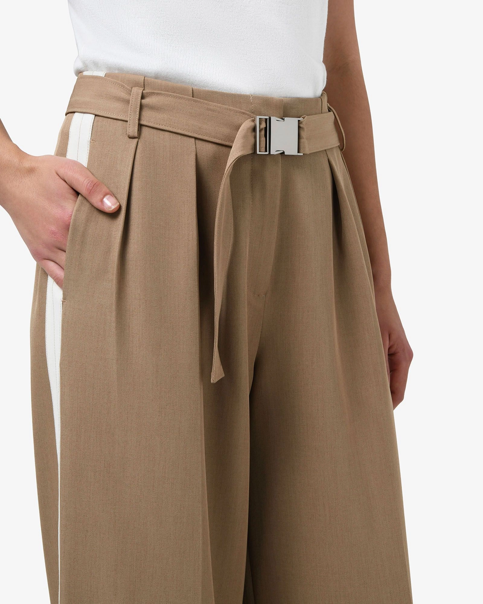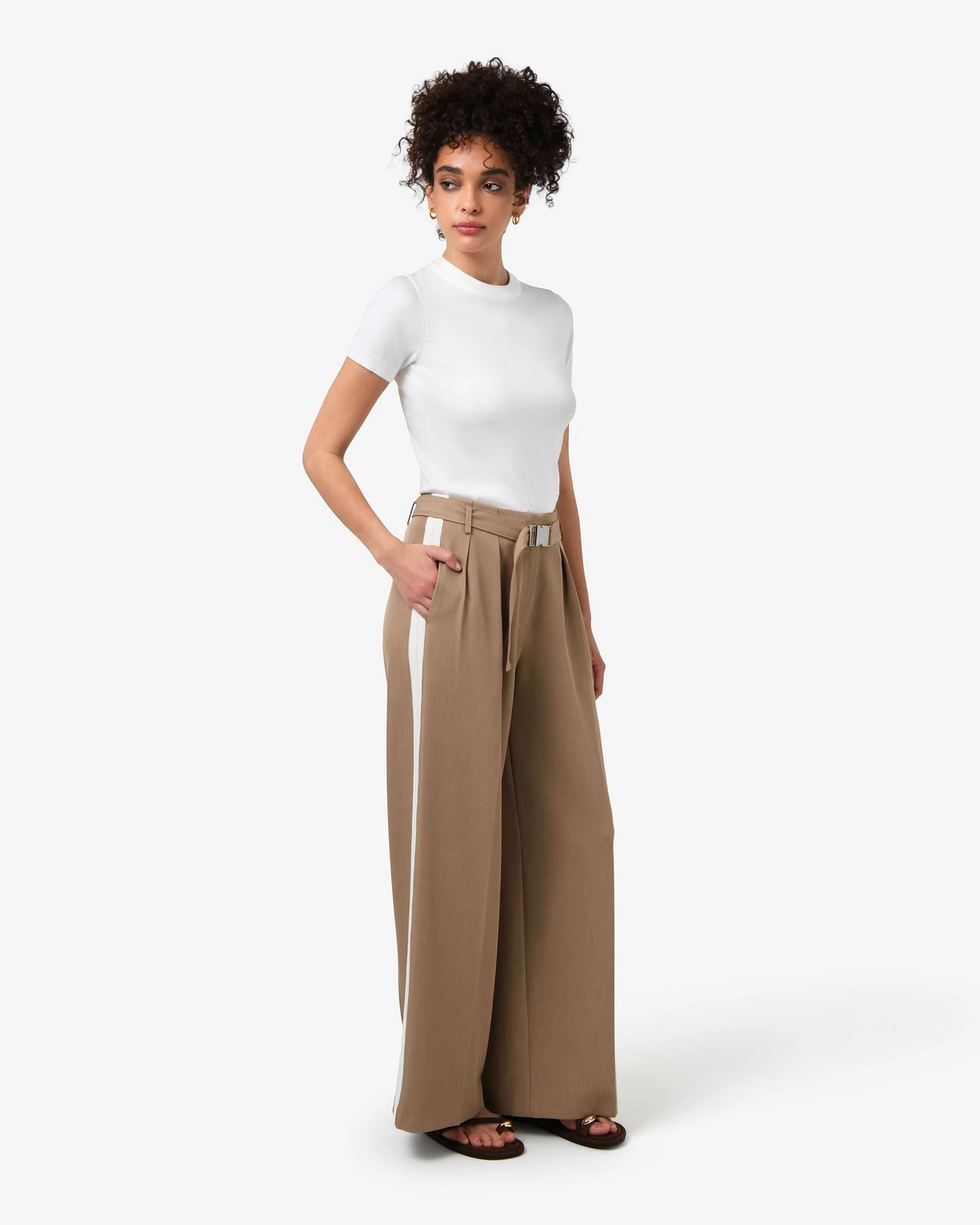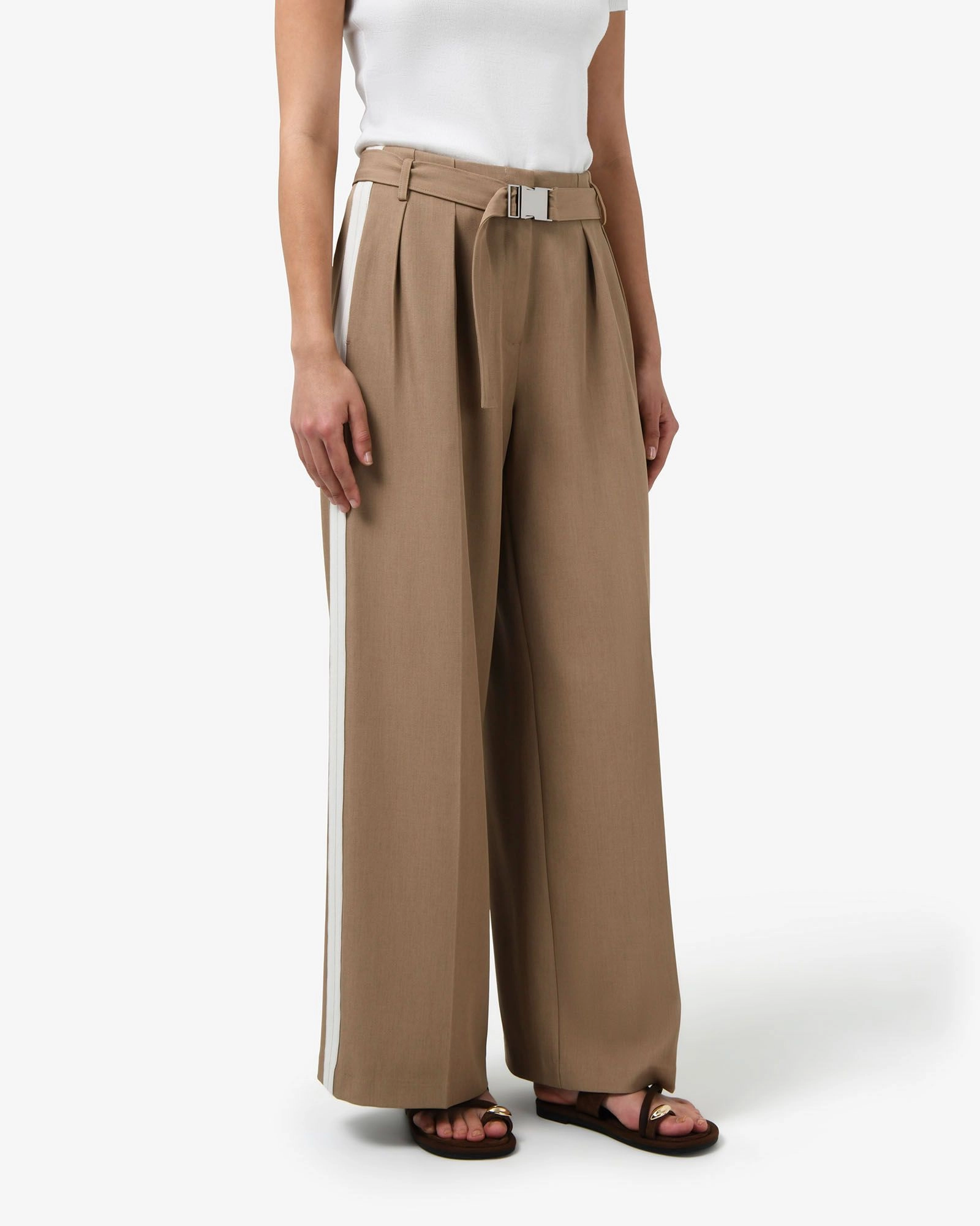 The Rowan Belted Contrast Pants are tailored to a high-waist silhouette with a fixed waistband and statement buckle belt. Featuring a white contrast side stripe and double front pleats that add structure and volume, the straight, wide-leg cut creates a clean, elongated look. Pair the pants with a top or blouse and finish with accessories to complete your look.