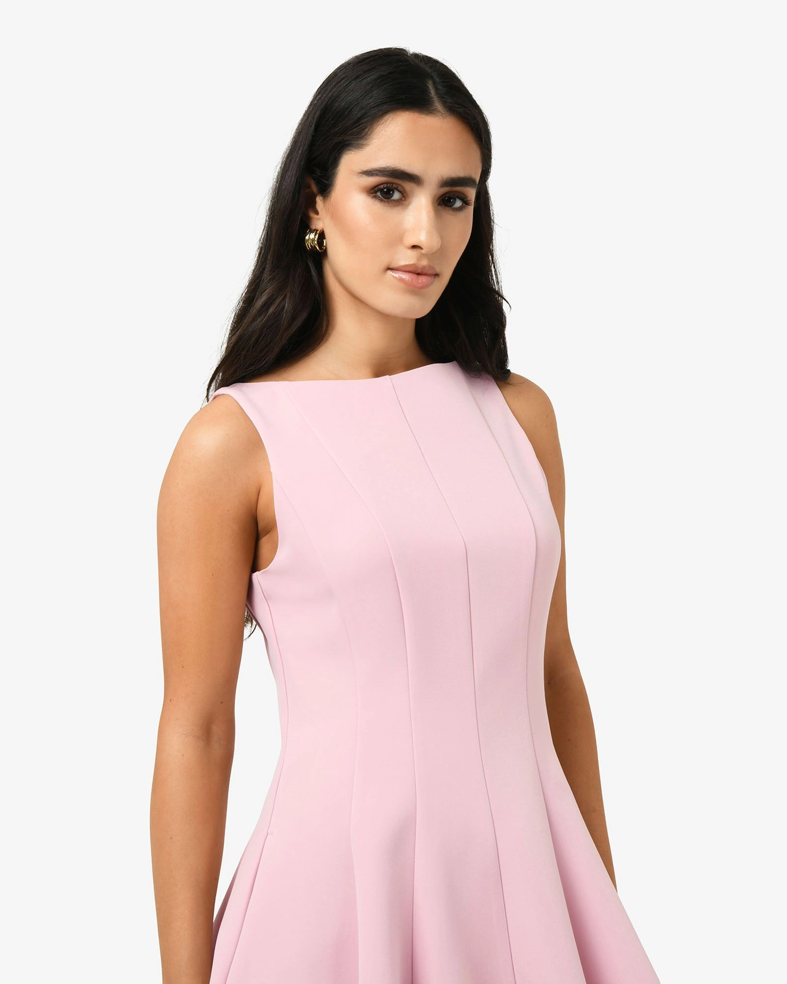 The Sandy Panel Mini Dress is sleek, structured, and effortlessly flattering. Fitted at the bodice and waist with a skater-style skirt, it shapes your silhouette beautifully. Panel details add subtle elegance, while the boat neckline and sleeveless design keep the look contemporary. Perfect for cocktail events, special occasions, or a chic night out.