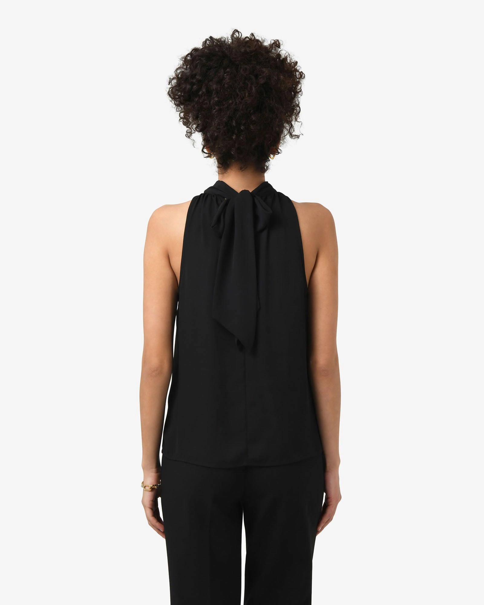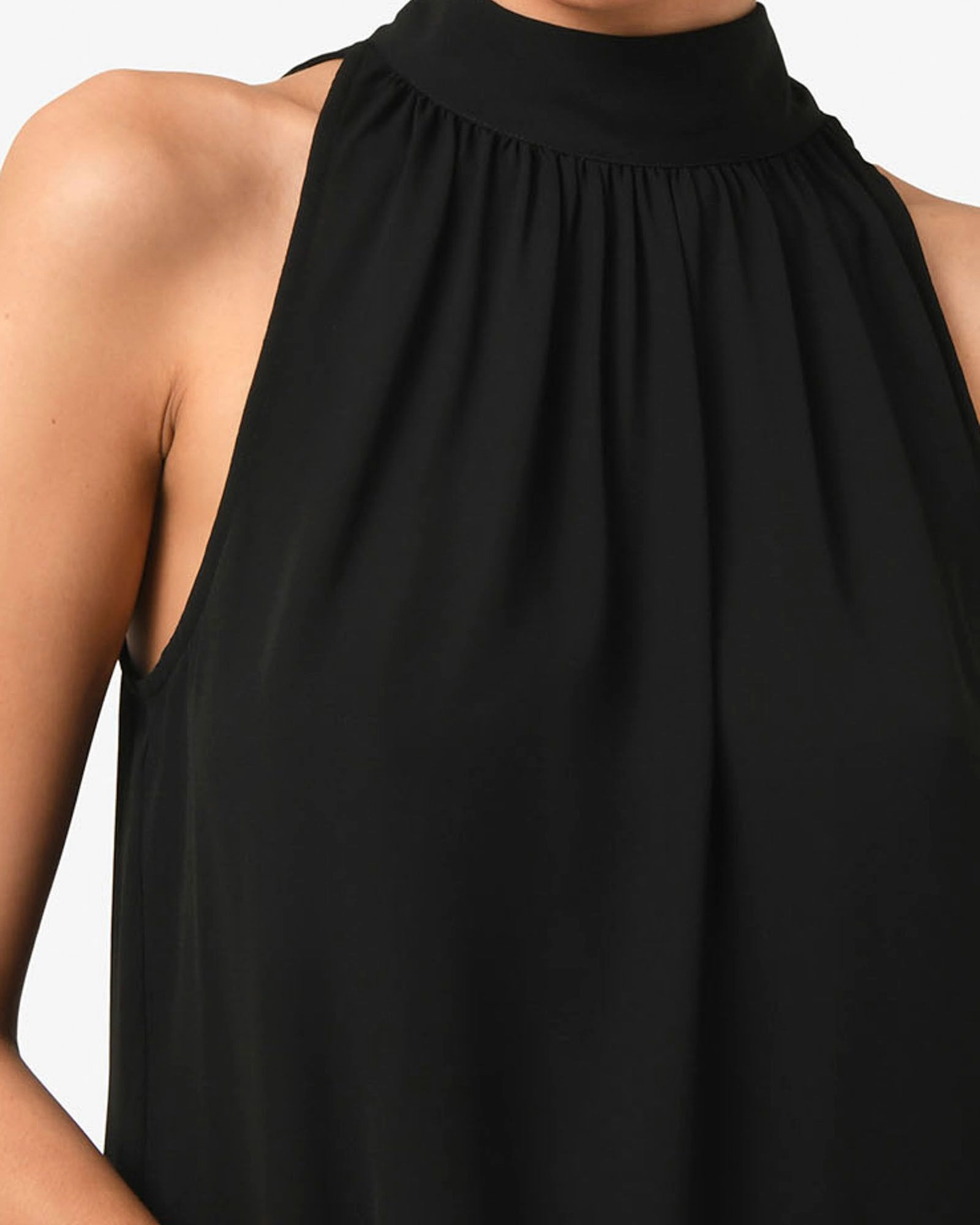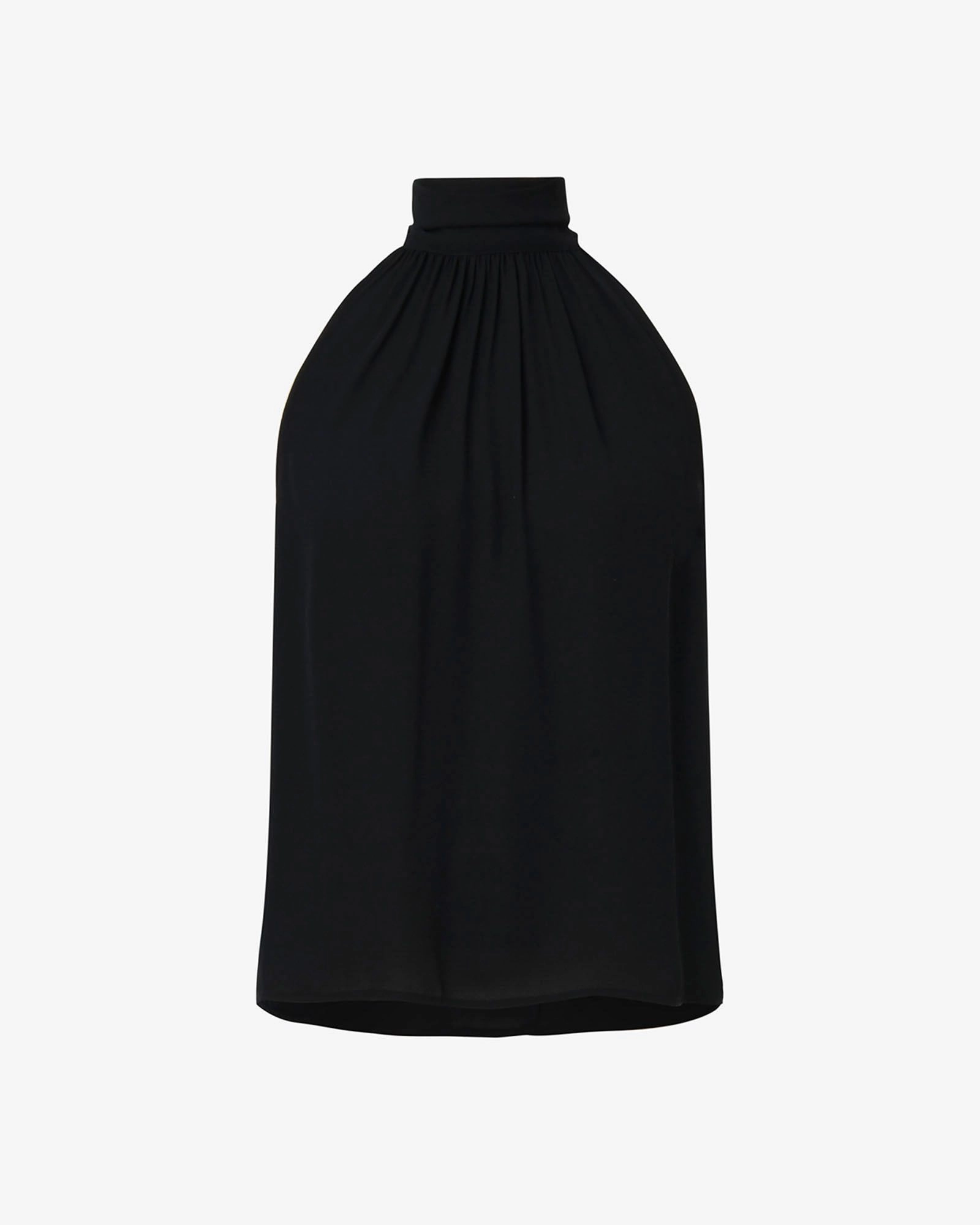 Designed with a racer cut and a high gathered neckline, the Shelby Draped Sleeveless Top features a back keyhole with a self-tie in a semi-sheer finish. A perfect after-work top, it pairs effortlessly with midi skirts and pants for an elevated look.