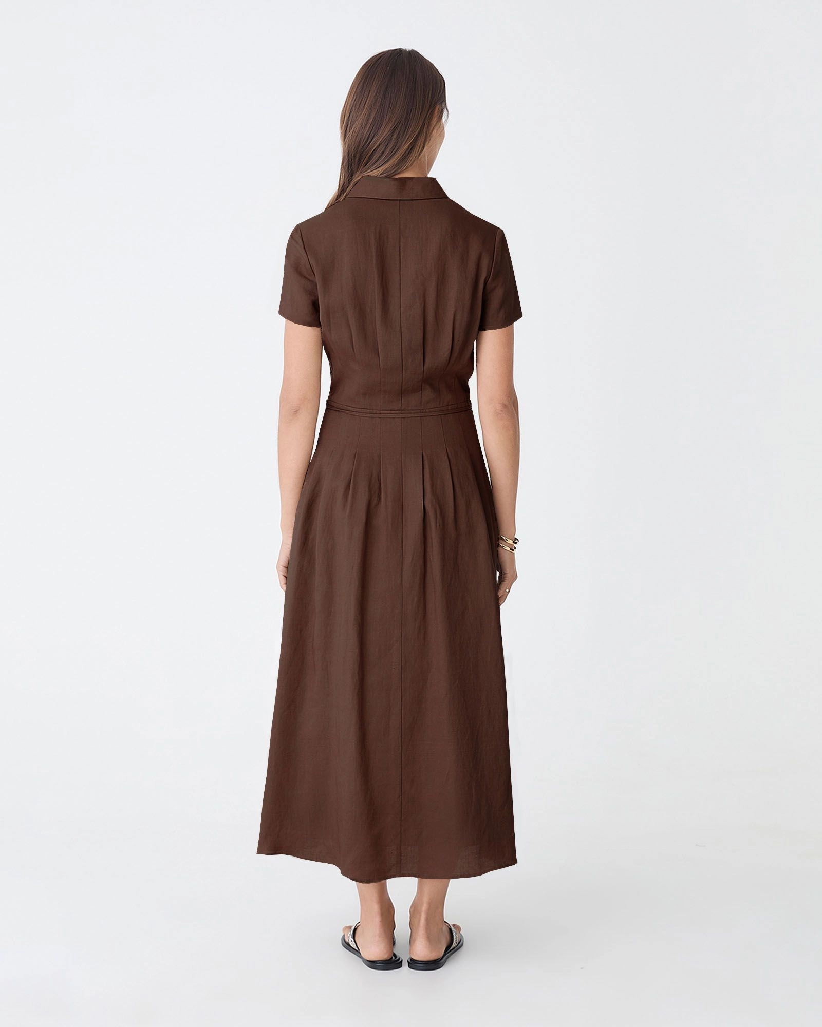 The Sophie Pleat Waist Linen Dress is made from linen-blend fabrication and features a classic shirt collar, short sleeves, and an A-line midi skirt with pleated details and functional side pockets. The removable self-tie belt defines the waist, while accessories complete a polished, ready-to-go look.