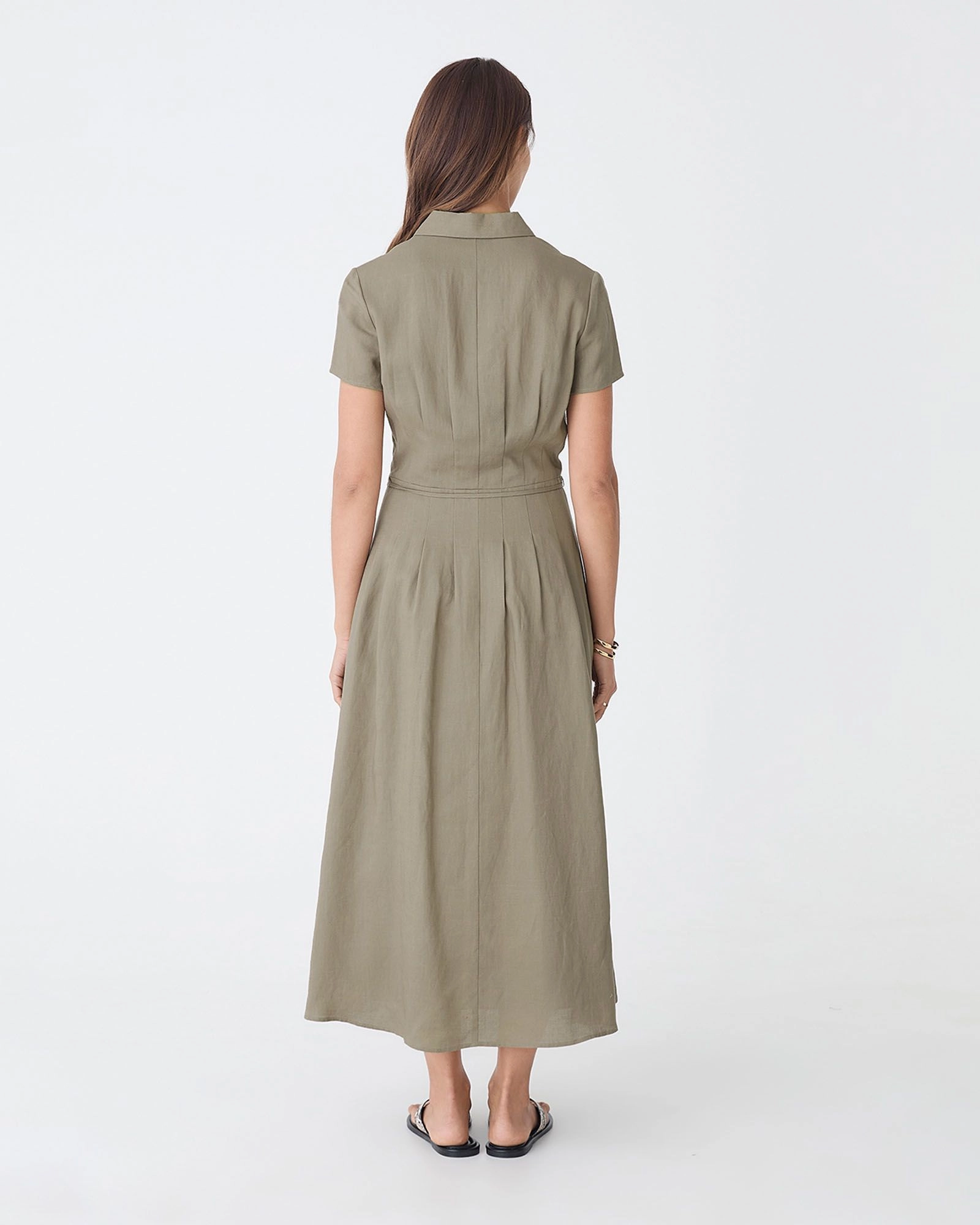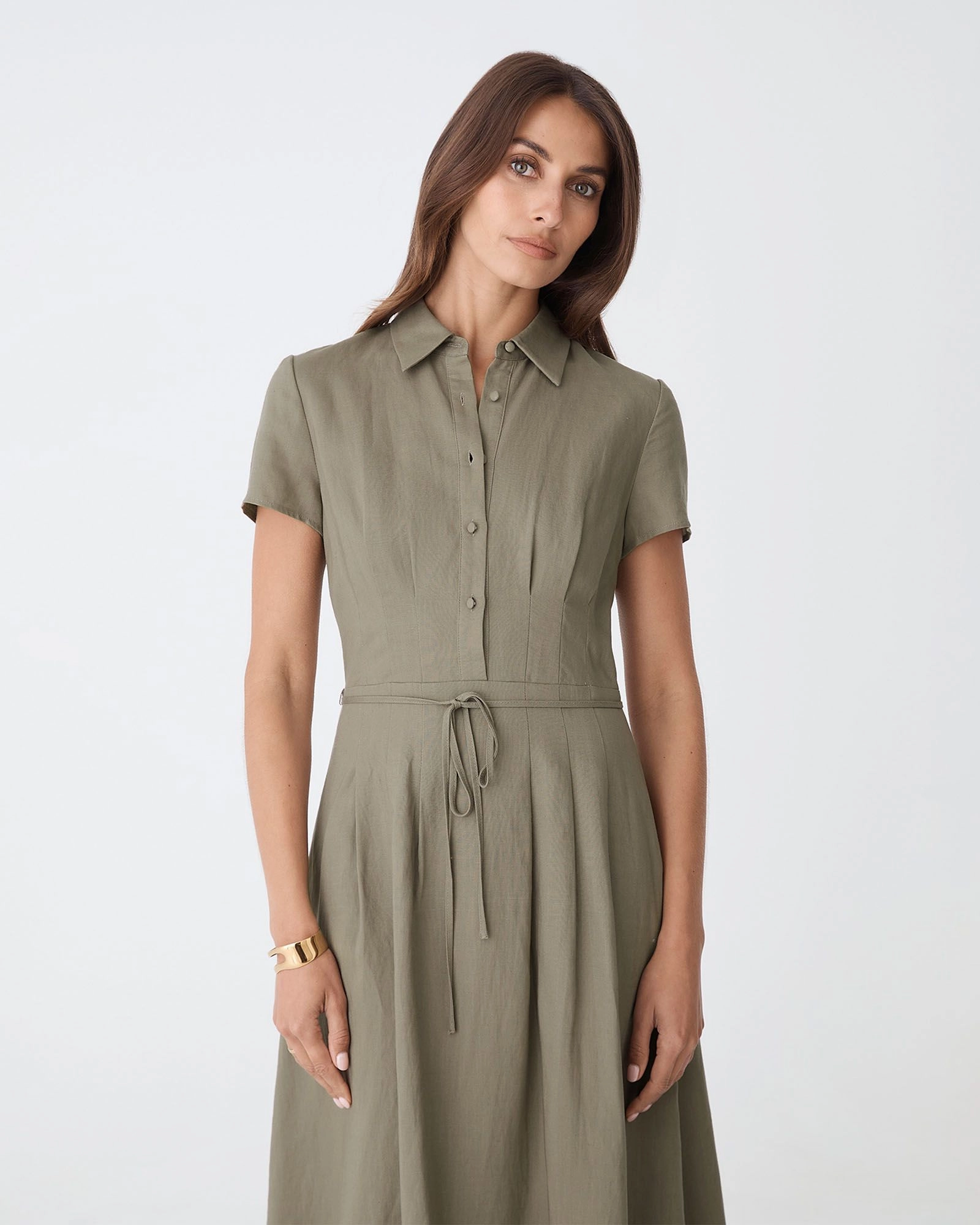 The Sophie Pleat Waist Linen Dress is made from linen-blend fabrication and features a classic shirt collar, short sleeves, and an A-line midi skirt with pleated details and functional side pockets. The removable self-tie belt defines the waist, while accessories complete a polished, ready-to-go look.