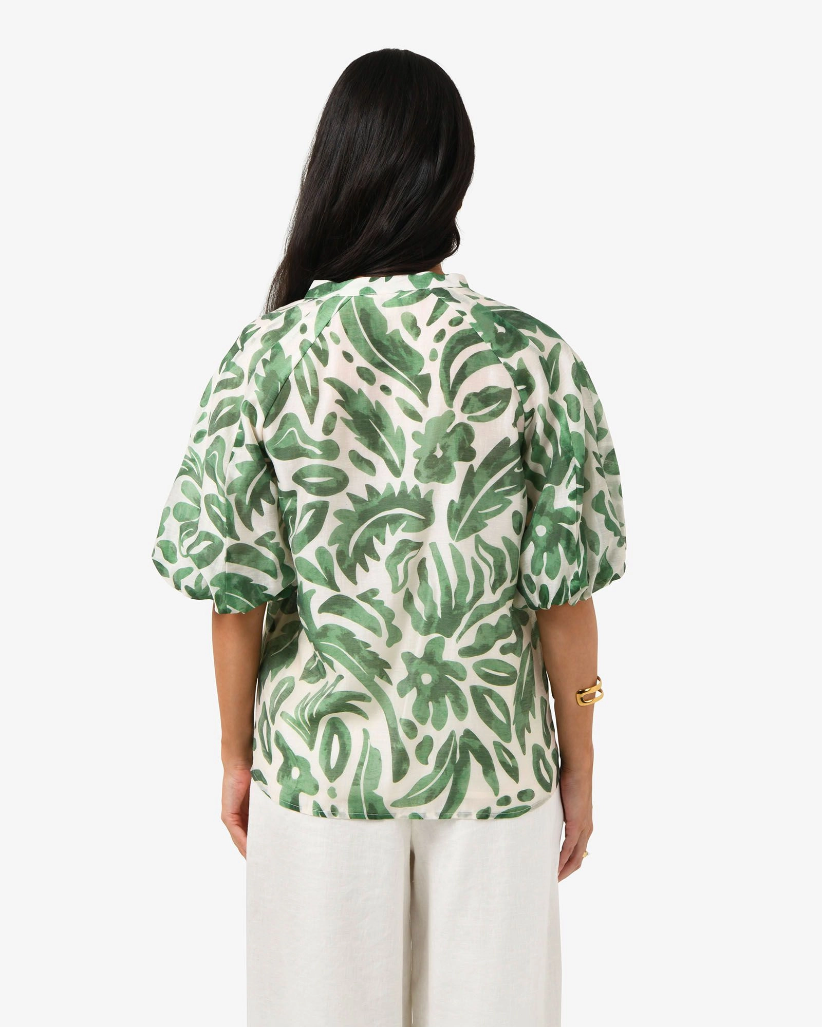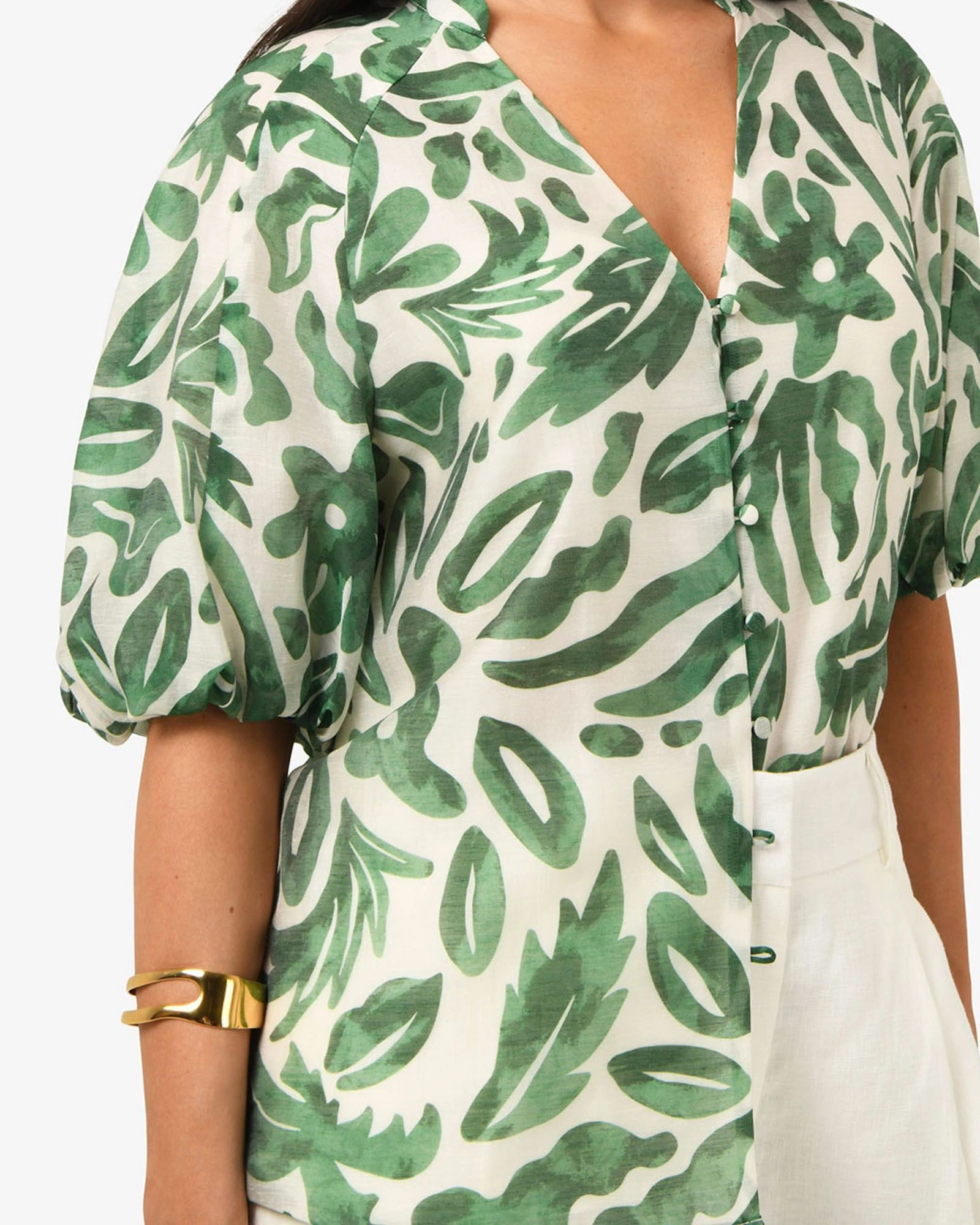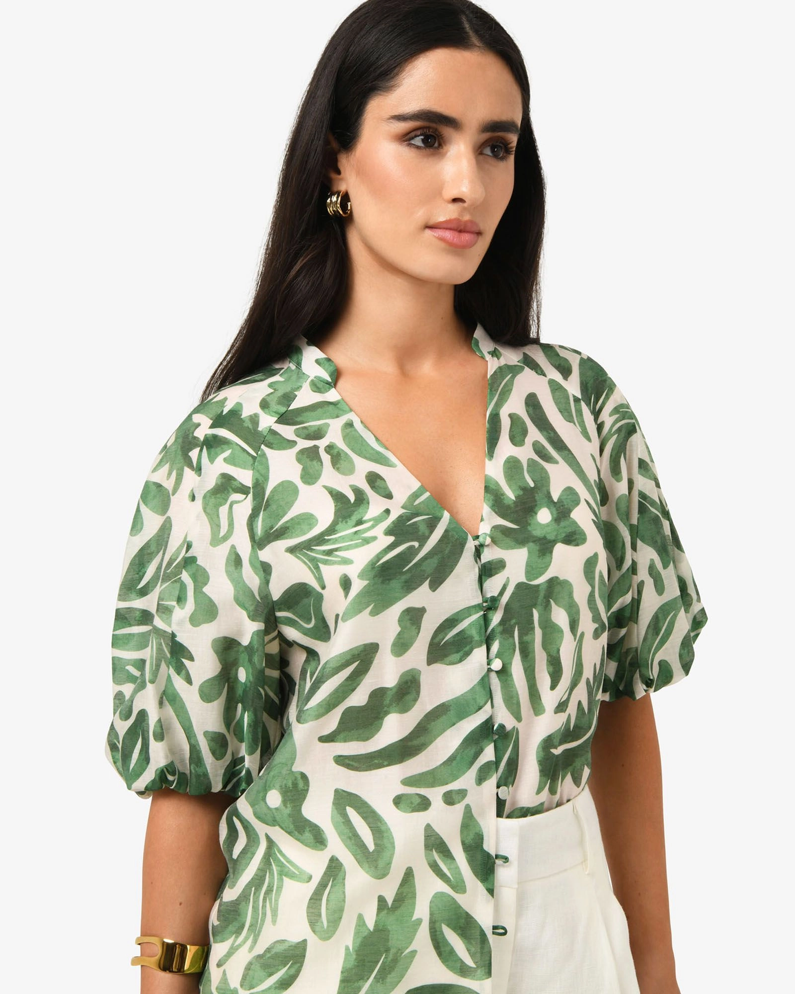 The Tallulah Puff Sleeve Top features a bold green-and-white botanical print with a flattering V-neckline, and softly structured puff sleeves. Its silhouette drapes effortlessly while the front button closure adds a polished touch. This statement top pairs beautifully with denim or wide leg pants for your casual daytime look.