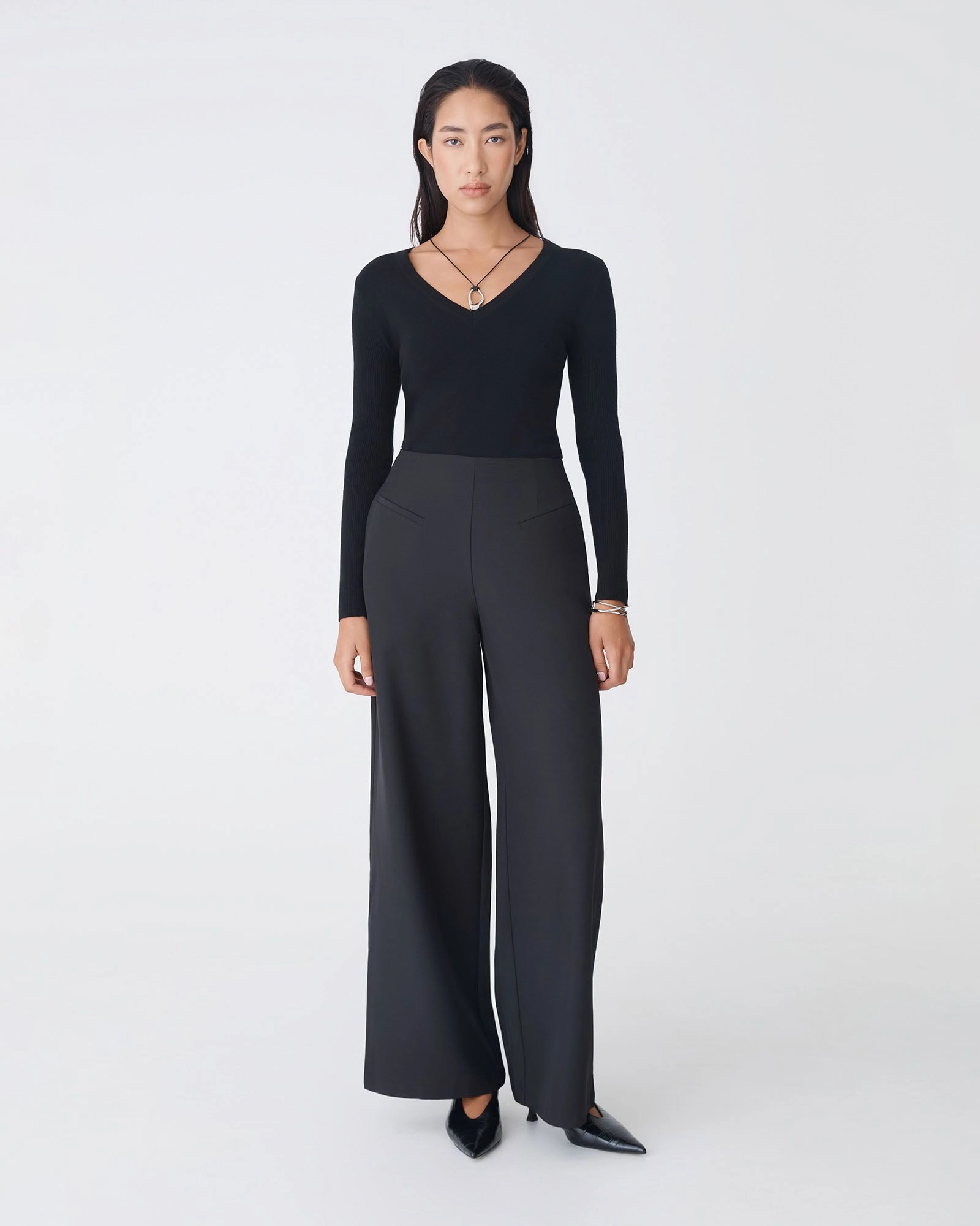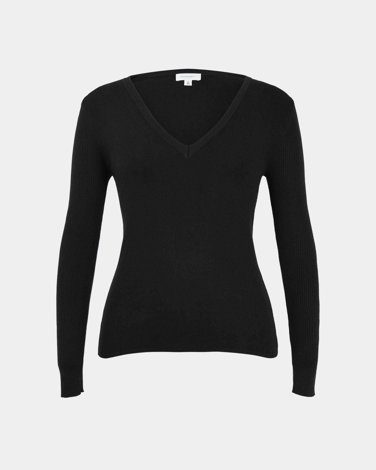 The Vicky V-Neck Knit is a sleek and sophisticated wardrobe essential. Featuring a statement V-neckline and long sleeves, it has ribbed detailing on the sleeves for added texture. It is medium weight with stretch fabrication offering a body hugging fit for all day comfort.