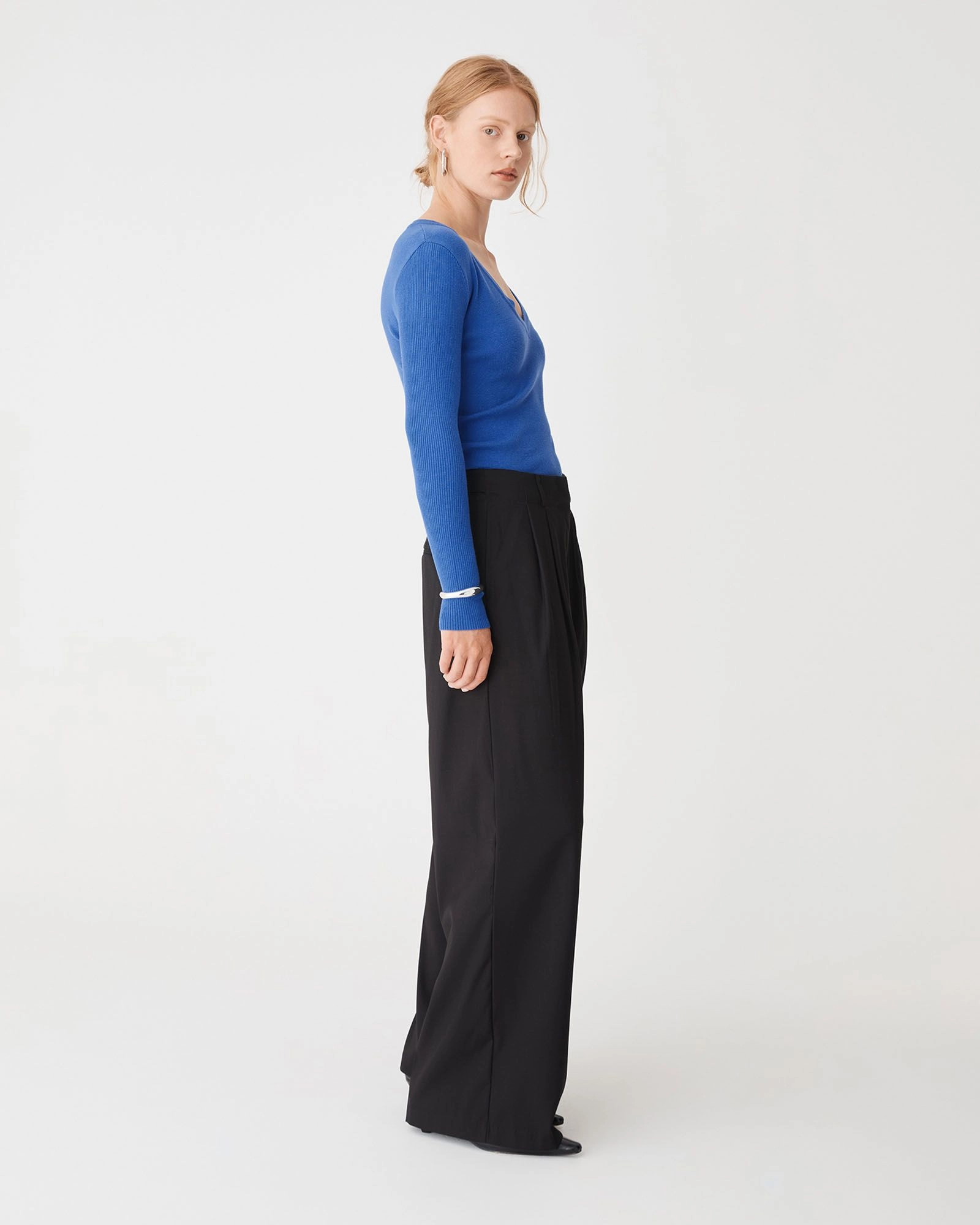 The Vicky V-Neck Knit is a sleek and sophisticated wardrobe essential. Featuring a statement V-neckline and long sleeves, it has ribbed detailing on the sleeves for added texture. It is medium weight with stretch fabrication offering a body hugging fit for all day comfort.