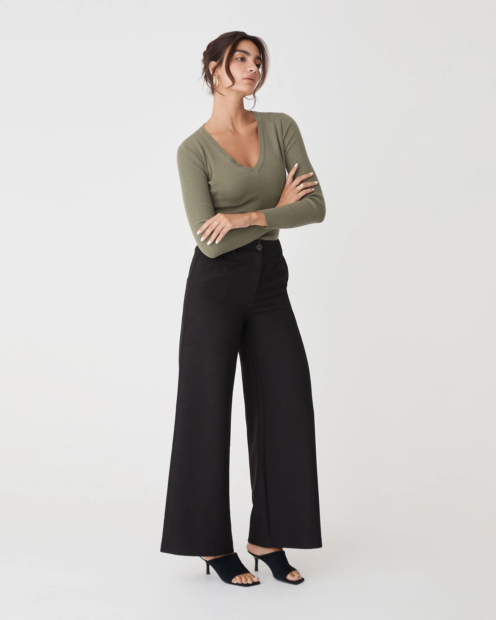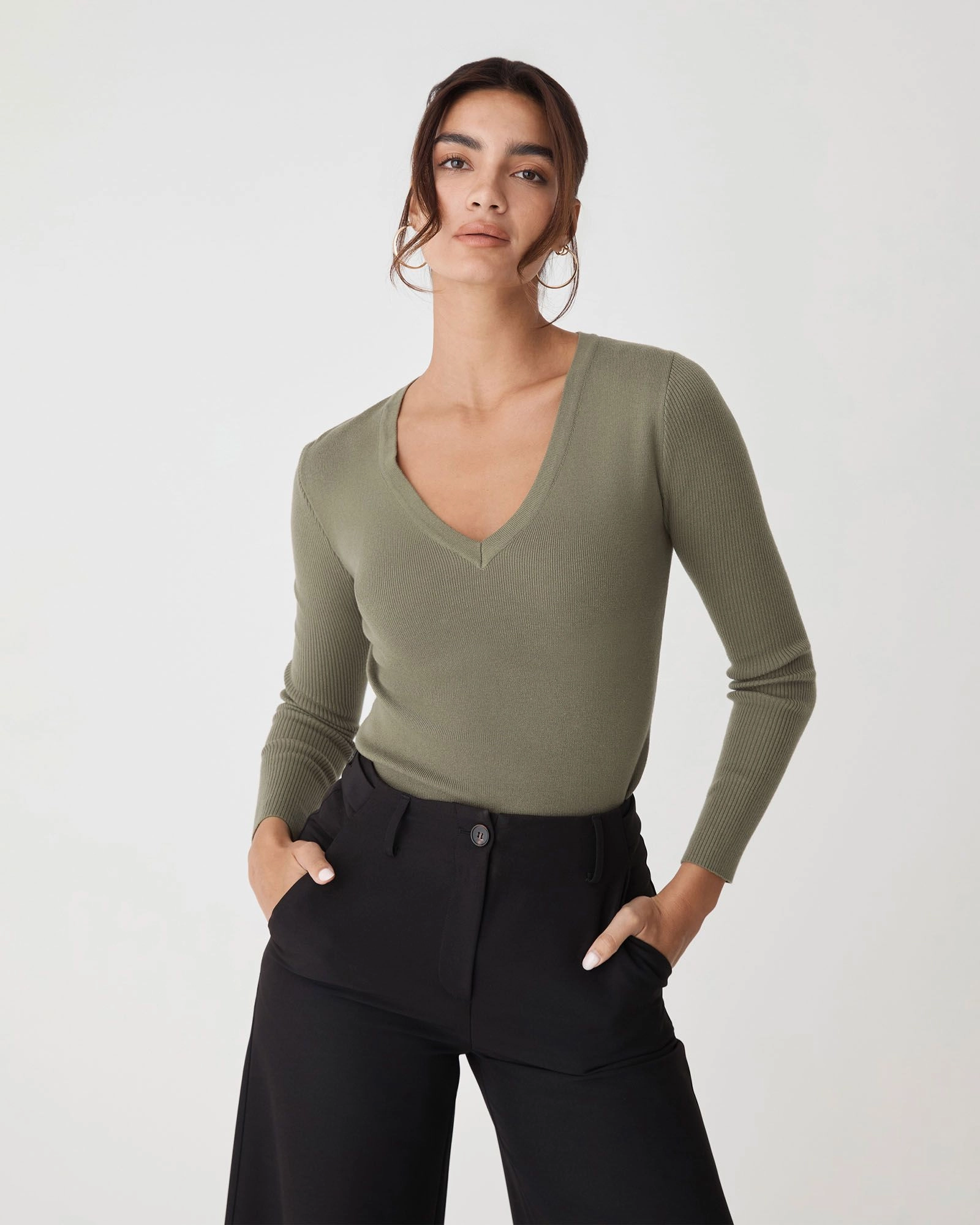 The Vicky V-Neck Knit is a sleek and sophisticated wardrobe essential. Featuring a statement V-neckline and long sleeves, it has ribbed detailing on the sleeves for added texture. It is medium weight with stretch fabrication offering a body hugging fit for all day comfort.