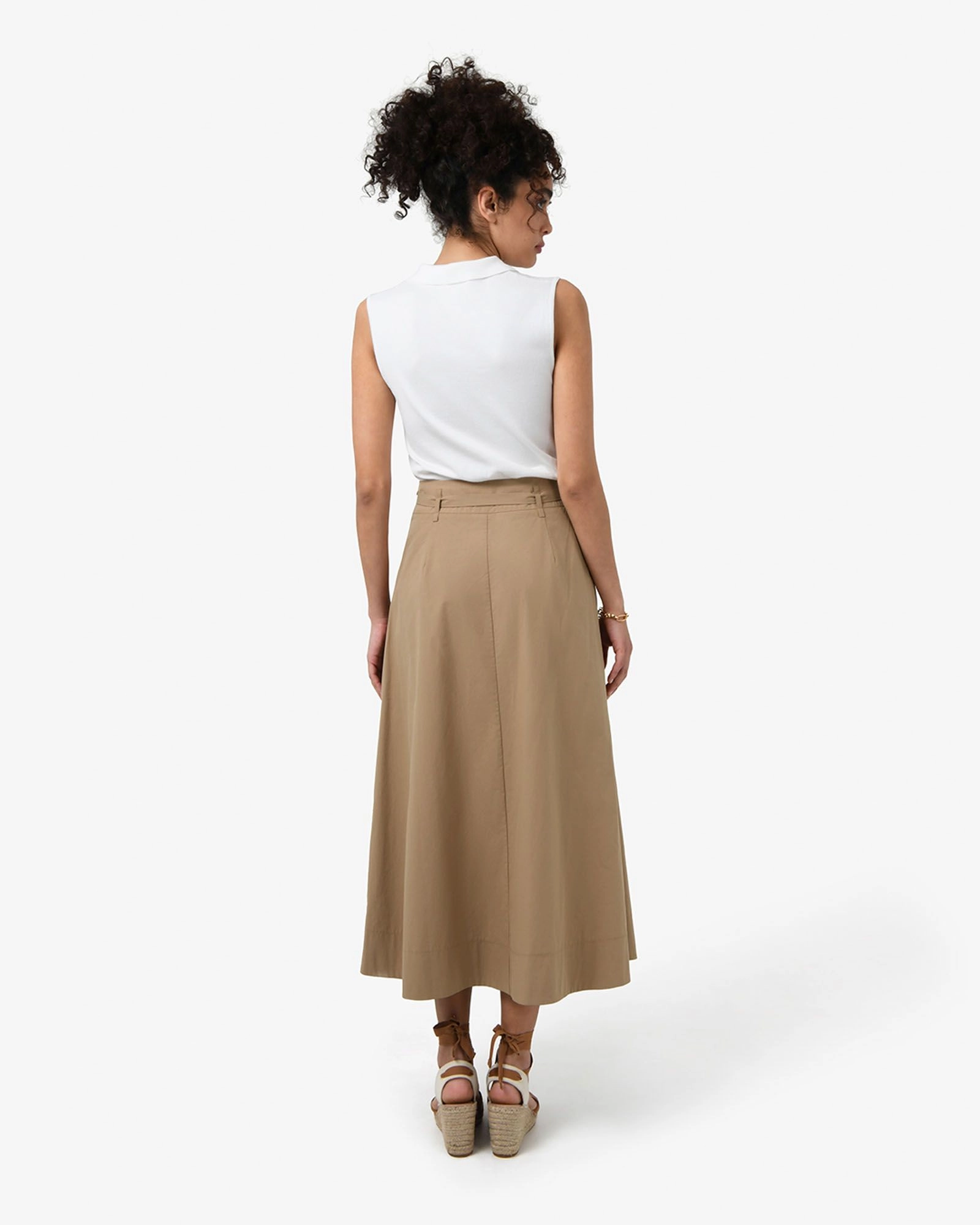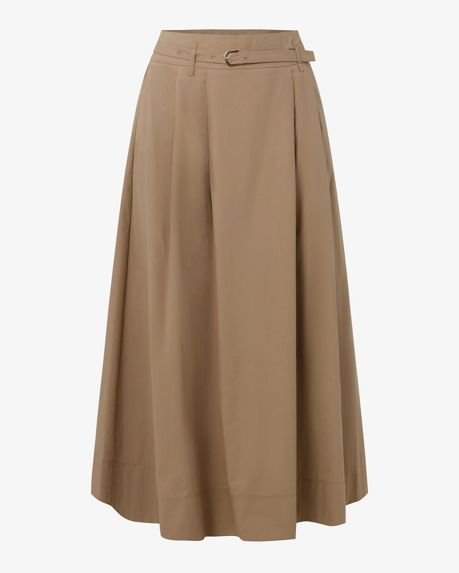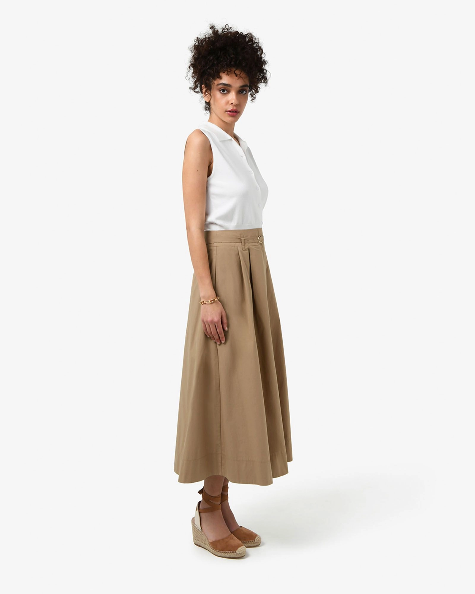 The Willow Cotton Belted Skirt offers a clean, structured silhouette in a soft cotton fabric. It features front double pleats, a fixed waistband with belt loops, and a matching fabric belt. Finished with side in-seam pockets and a high-rise A-line fit, the skirt can be dressed up or down - style it with a fitted top and statement accessories for an elevated look.
