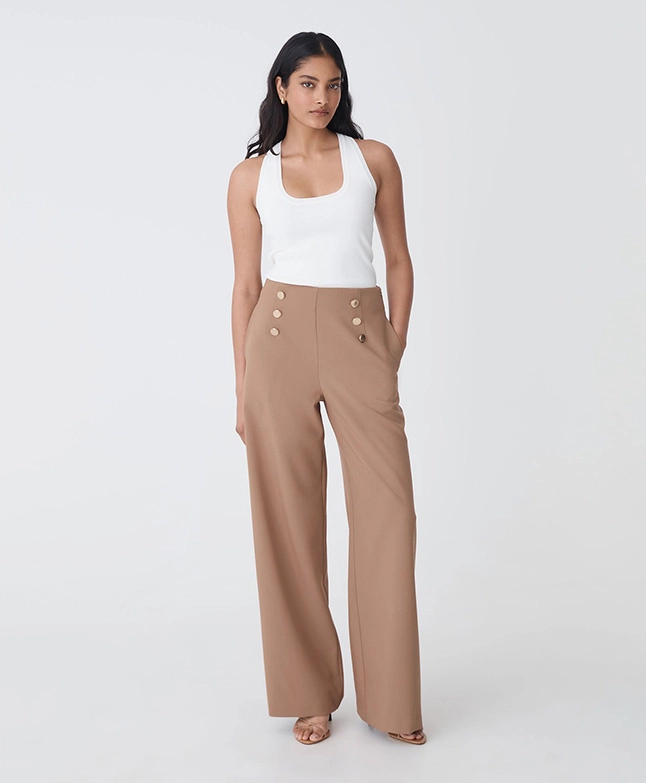 Straighter-leg, classic flat front trousers like our Merid Tailored Pants, are ideal for a modern yet timeless corporate look. This silhouette avoids adding bulk at the waist or hips, making it a flattering option for many women."