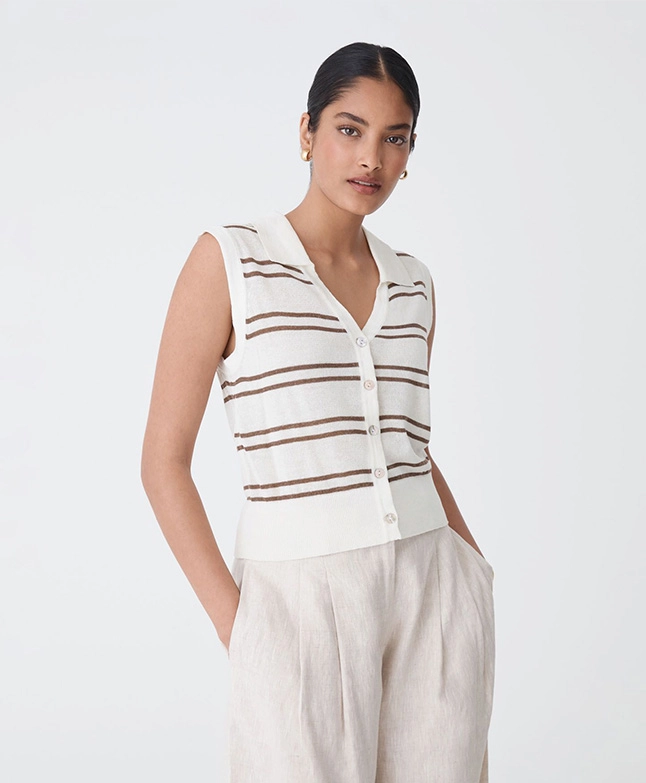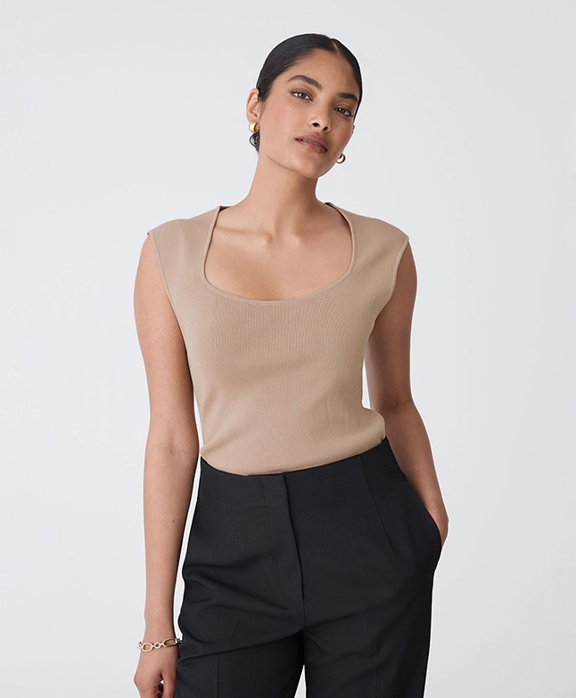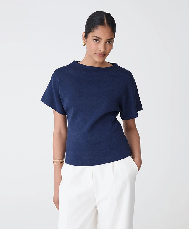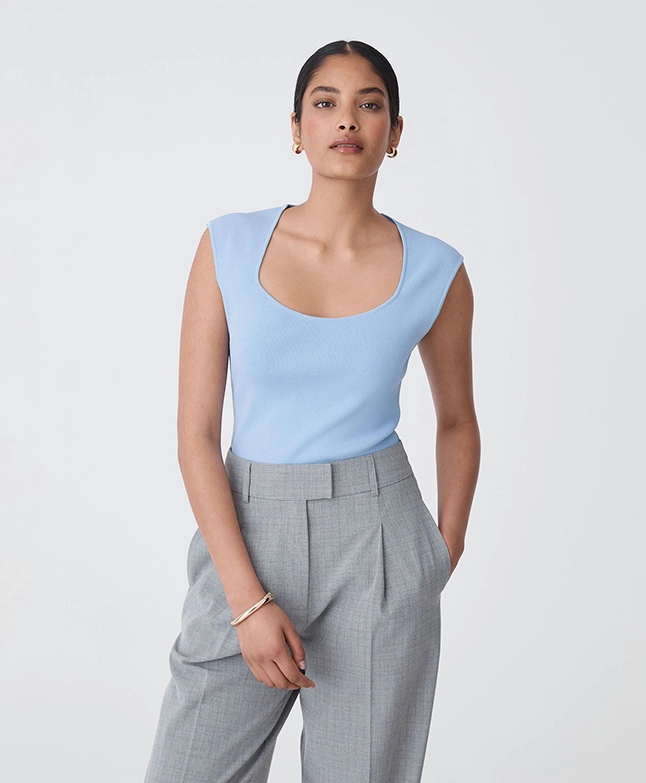 "For everyday workwear, classic button-up shirts are a timeless choice, instantly adding an elevated style. V-necks create balance through the chest and neckline without feeling too low-cut, while boat necks offer an elegant, refined finish. If you struggle with crew-necks looking too casual for work, try opting for different fabrics like fine wool or a more fitted material for a sophisticated finish."