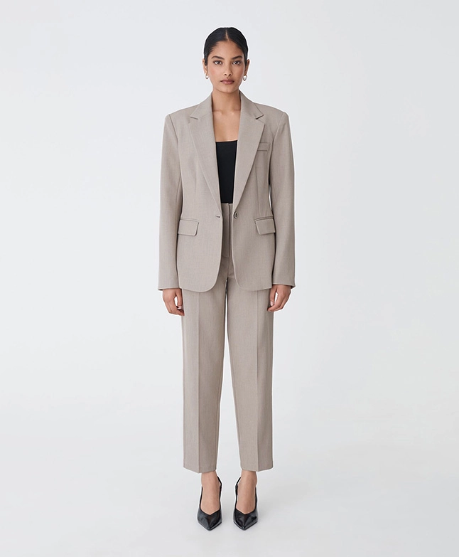 "One of my favourite things about suit sets is how simple details like shoulder details or buttons can really change the overall look. Some key blazer and suiting trends we’re seeing in 2026, are structured blazers with 80's inspired power shapes, and waist-defining silhouettes. I love that the built-in belts and cinched waists are everywhere at the moment! It’s so flattering! Collarless looks are also making a comeback as an alternative to the traditional lapels. Our soon to release Aaria Suit Set is ticking at least two of those buckets. You’re welcome!"