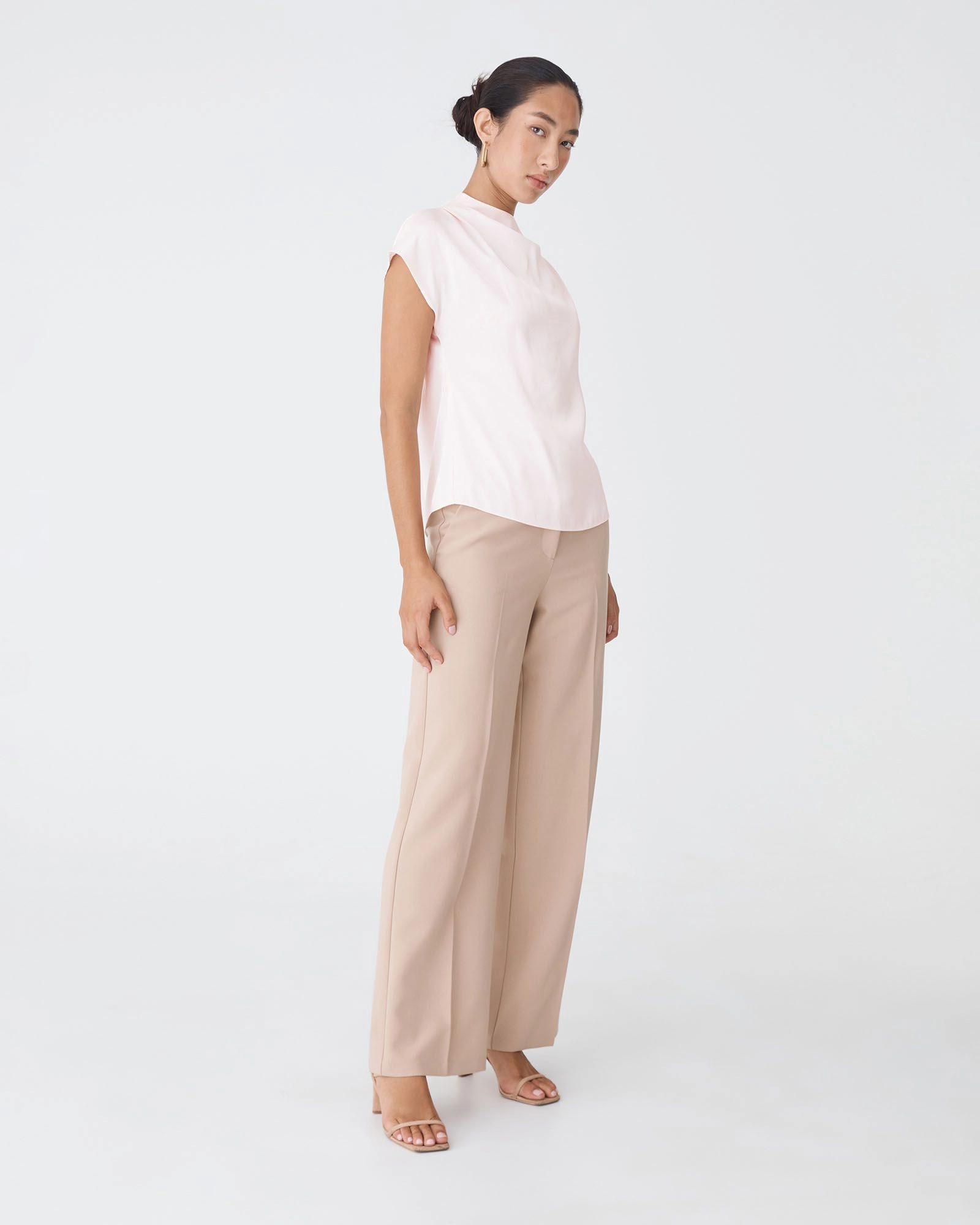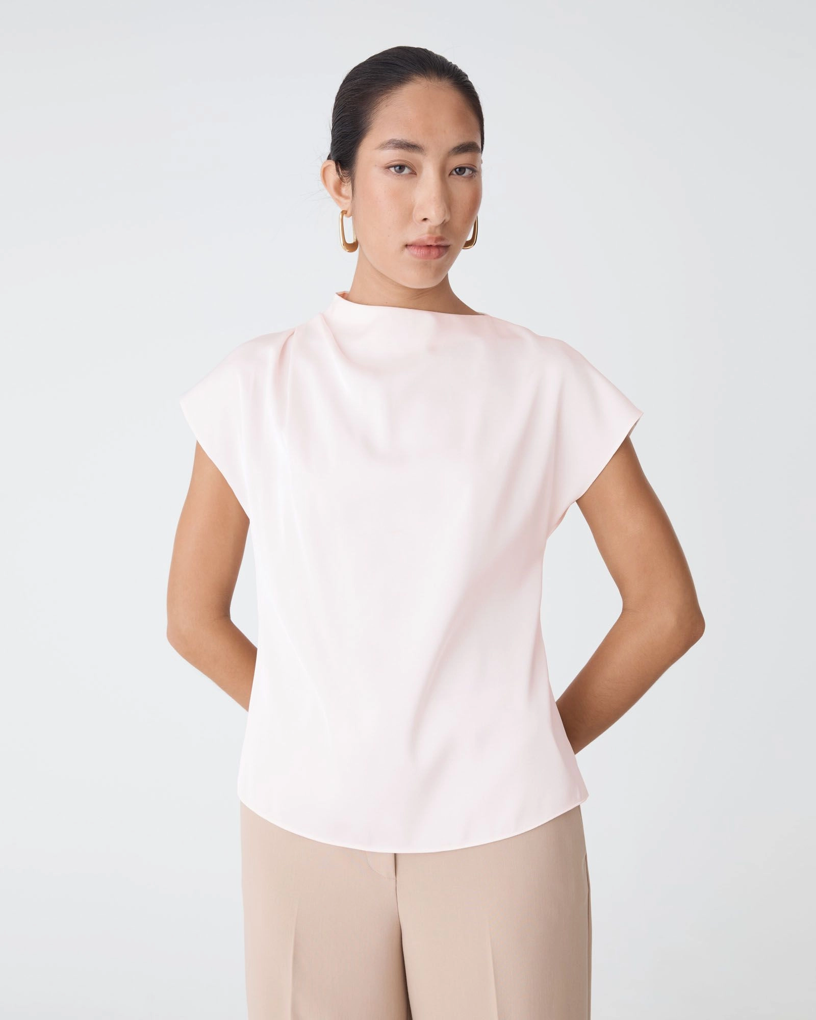 - Asymmetric pleated draped neckline