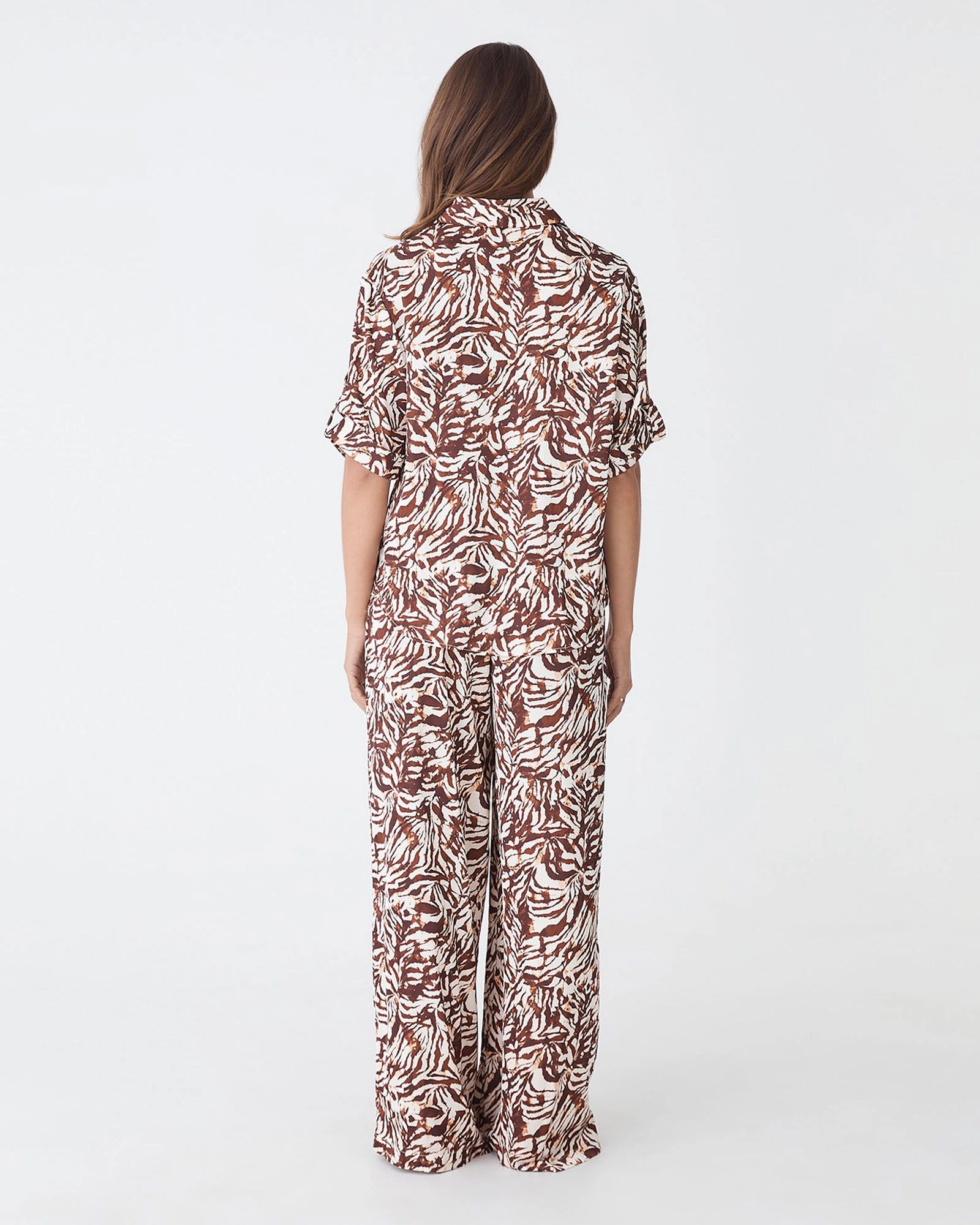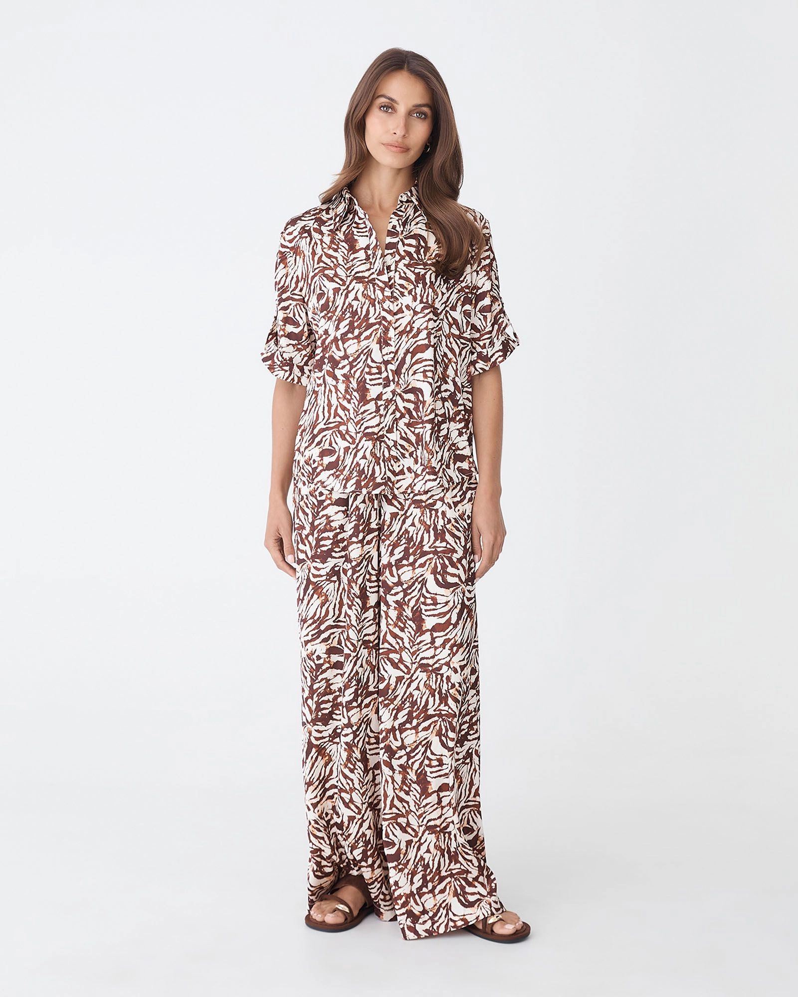 The Zuhara Roll Cuff Shirt combines relaxed comfort with a bold brown zebra print. Featuring short sleeves with rolled cuffs, a functional button-front placket and lightweight fabrication, it pairs seamlessly with the matching Zuhara Drawstring Pull-On Pants or style with your casual wide-leg pants or shorts for an easy, coordinated look.